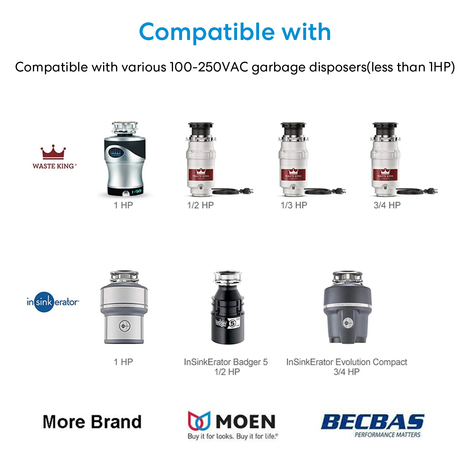 - Amplia compatibilidad, carga de 16 A, adecuada para la mayoría de marcas de trituradores de basura (menos de 1 HP).
