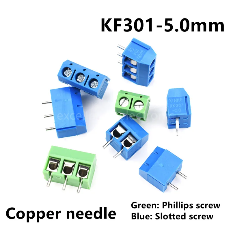 Comprar Lote de 10-100 unidades de KF301-5.0-2P de paso de 5,0mm, aguja de cobre, Pin recto 2P 3P, tornillo PCB, Conector de bloque de terminales azul y verde