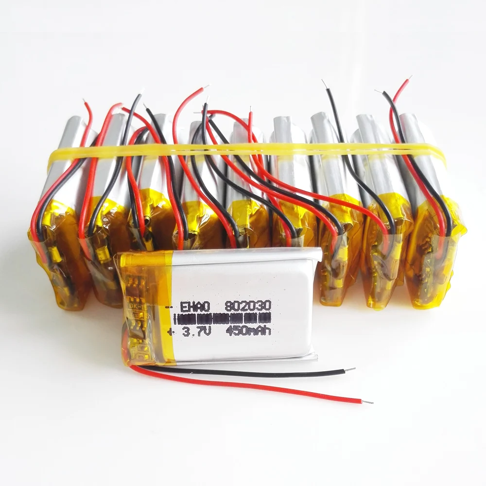 Venta al por mayor 10 piezas 3,7 V 450 mAh802030 Batería recargable de iones de litio Li-Po de polímero de litio para cámara Mp3, bluetooth, GPS, PSP, pieza electrónica móvil