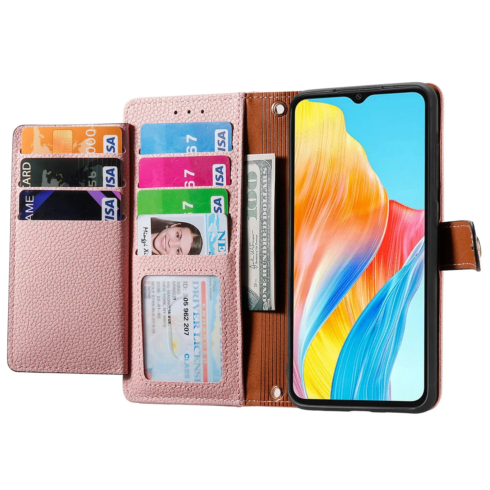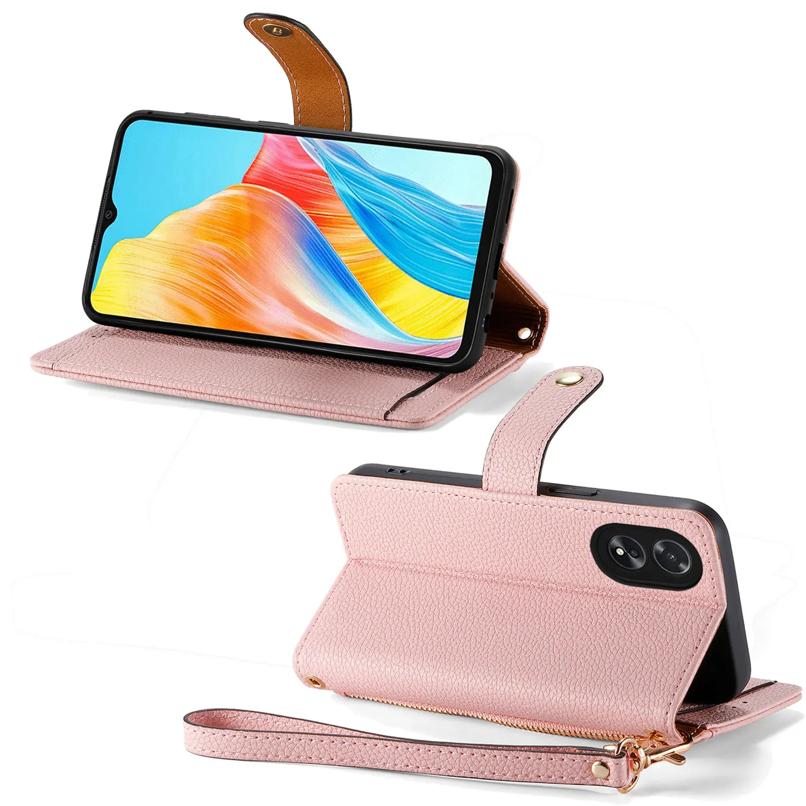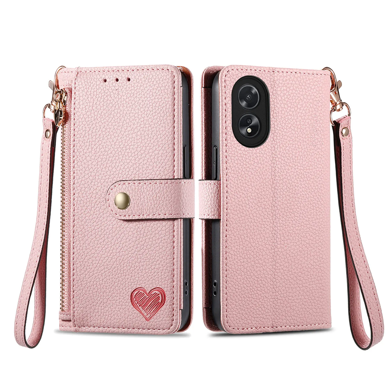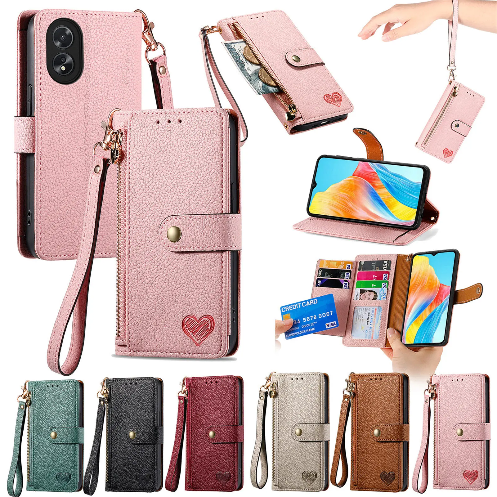Comprar Love Heart Zipper Cards Solt Flip Leather Wallet Case para OPPO A58 A78 A38 A54 A74 A57 A55 C55 C53 Strap Book Bag Pocket Cover