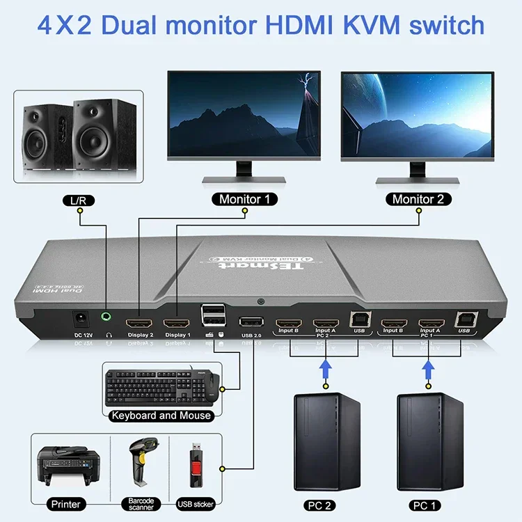 Conmutador KVM de doble monitor 4x2 HDMI + HDMI