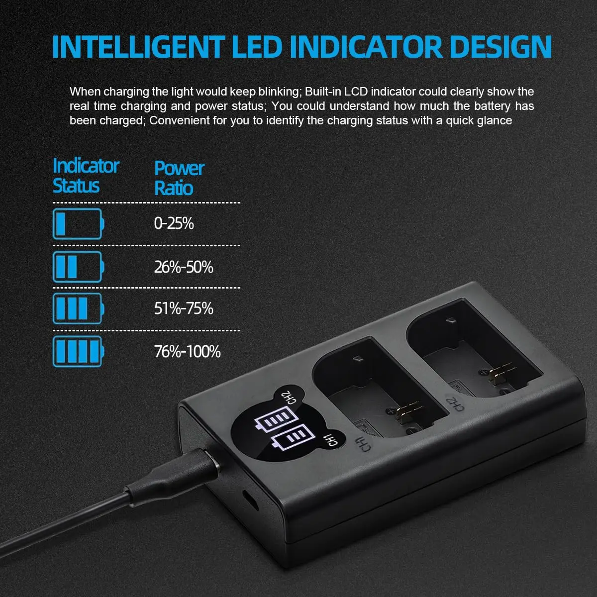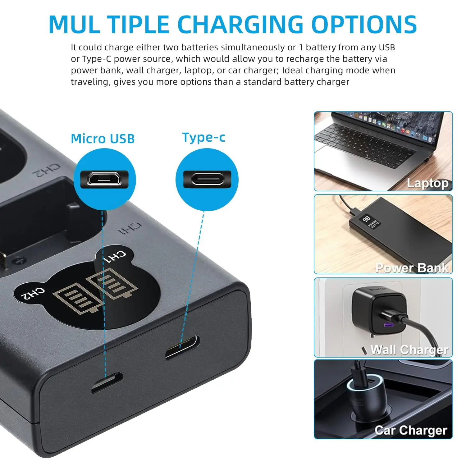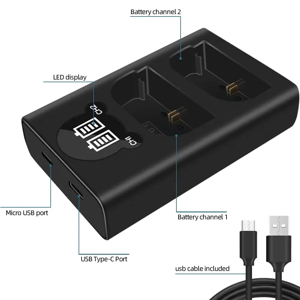 Canon LC-E6ECanon CBC-E6Compatible con los siguientes modelos de cámara:Canon EOS 5D Mark IICanon EOS 5D Mark III Canon EOS 5D Mark IV Canon EOS 5DS Canon EOS 5DS R Canon EOS 6D Canon EOS 6D Mark II Canon EOS 7DCanon EOS 7D Mark II Canon EOS 60D Canon EOS 60Da Canon EOS 70D Canon EOS 80D Canon EOS R Canon XC10 Canon XC15 Especificación: Material: plástico ABS Entrada: 5V 2.1A Salida: 8,4 V 700mA x 1, 8,4 V 500mA x 2 Tamaño: 90x56x22mm Descripción: 1. Cargador dual LED USB, puede cargar 2 baterías al mismo tiempo. 2. Nuevo diseño, fácil de transportar. El cargador 3. El cargador LED inteligente muestra el estado de carga y la capacidad de la batería. 4. Puerto de entrada dual Micro USB y USB tipo C, proporciona más opciones de carga para usted. 5. Adecuado Para Canon Baterías recargables. Contenido del paquete 1 * cargador dual con pantalla LED inteligente 1 * Cable de carga micro USB Nota: Primero electrifique el cargador, luego instale la batería, para mostrar la potencia de la batería con mayor precisión.
