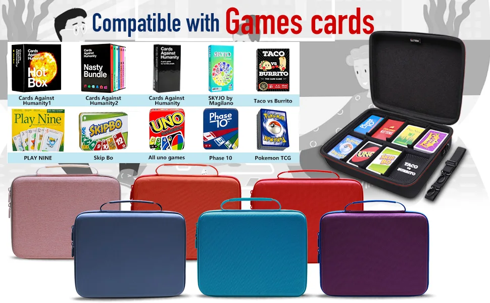 【Ajuste perfecto】: Diseñamos especialmente el estuche para que se ajuste a su tarjeta de juego, puede contener más de 2500 y más, compatible con varias tarjetas de juego como SKYJO/UNO/Taco Cat Goat Cheese Pizza. DIMENSIONES EXTERIORES: 11,5" L - 9,1" W - 3,5" H.