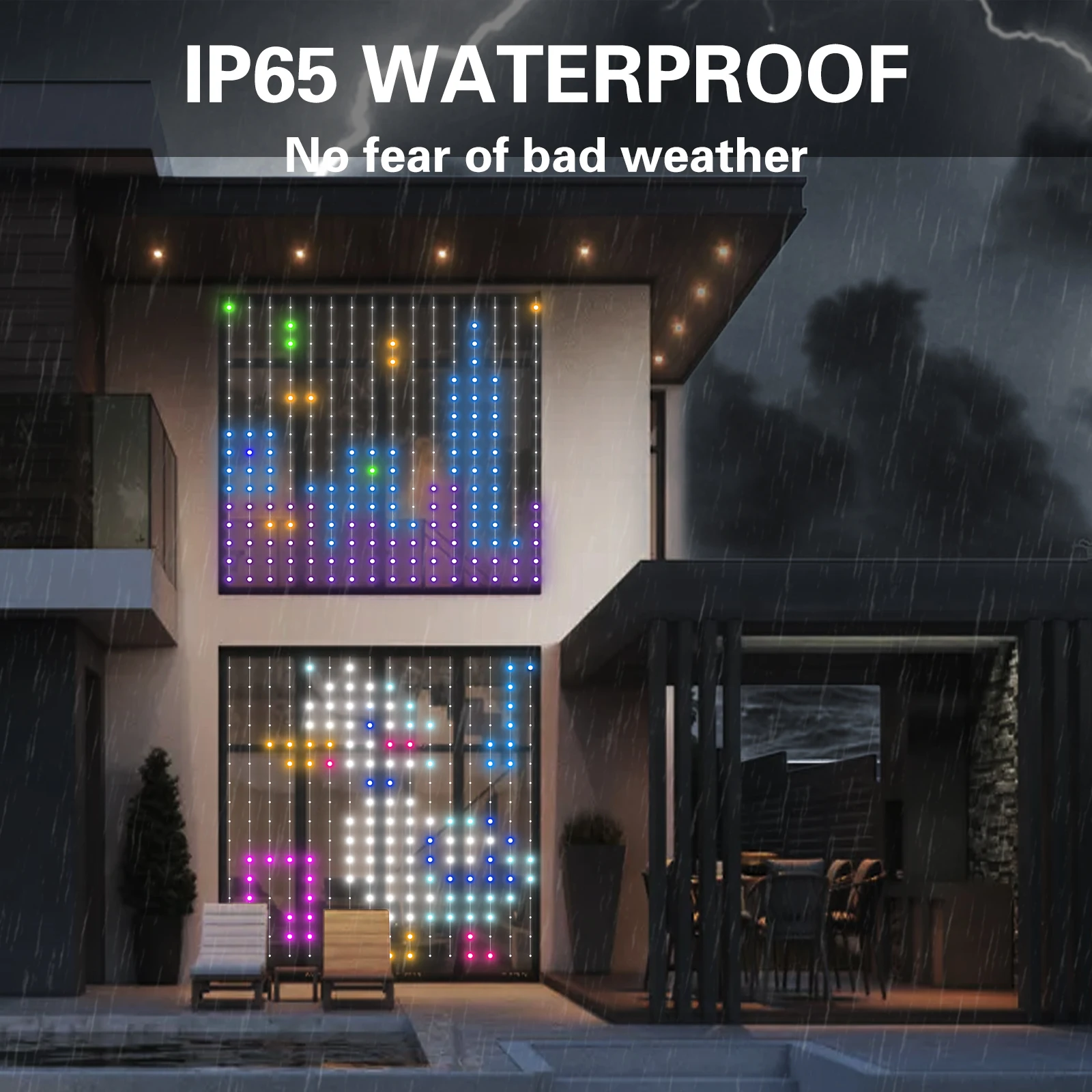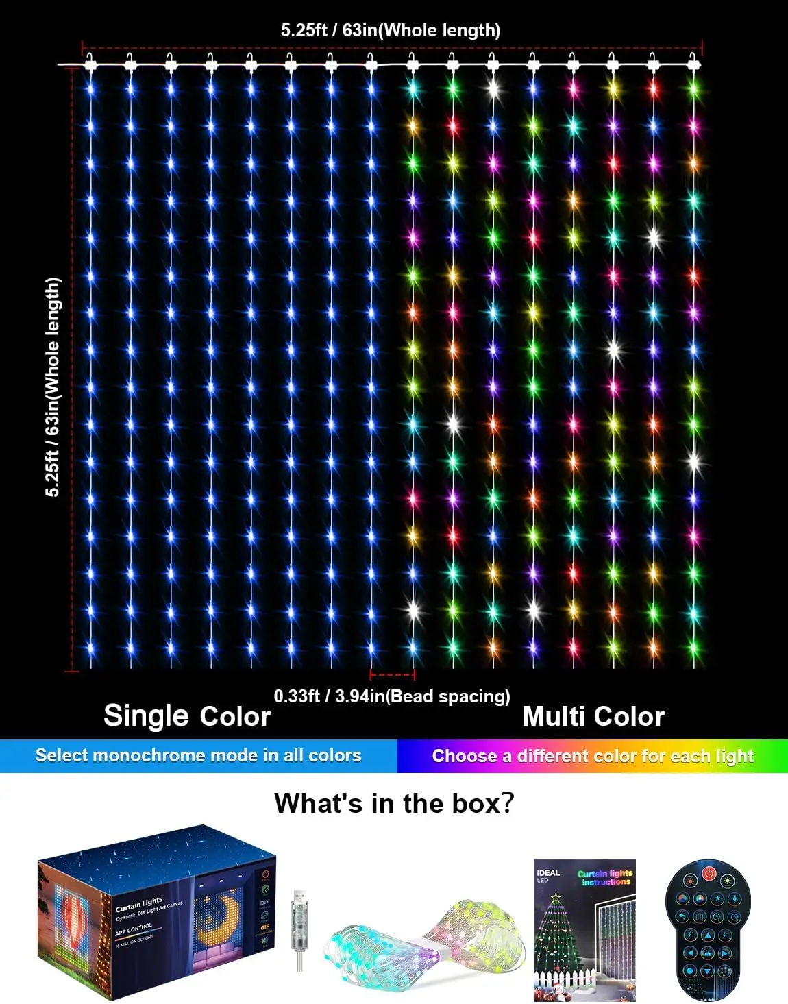 Nuestras luces de cortina inteligentes miden 5,25 x 5,25 pies, que se pueden controlar a través de la aplicación y el control remoto, tienen 256 luces LED aisladas, capaces de renderizar patrones degradados de color y texto de alto píxel.Fácil de instalar y usar, es ideal para decoraciones navideñas de ventanas y paredes.