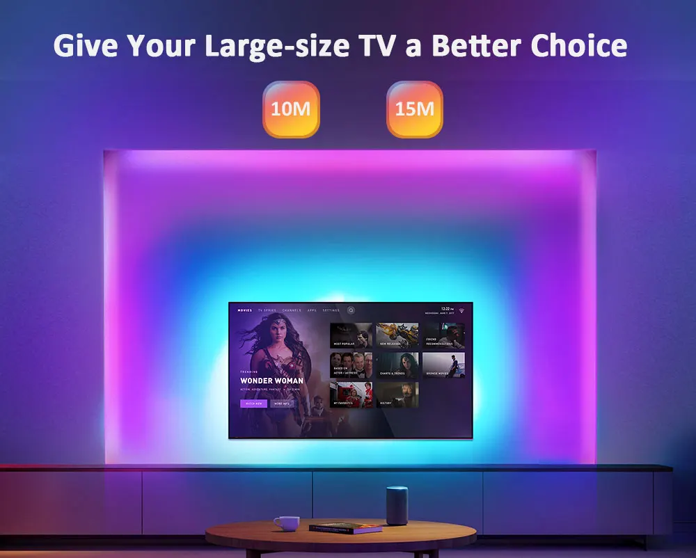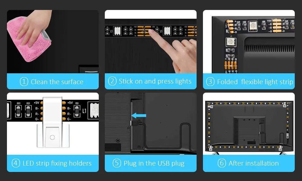 Antes de usar, asegúrese de que la superficie esté limpia y seca, luego pase la tira de luz en la parte posterior del televisor, inserte la tira led en el puerto de tv, use la aplicación para controlar la tira led