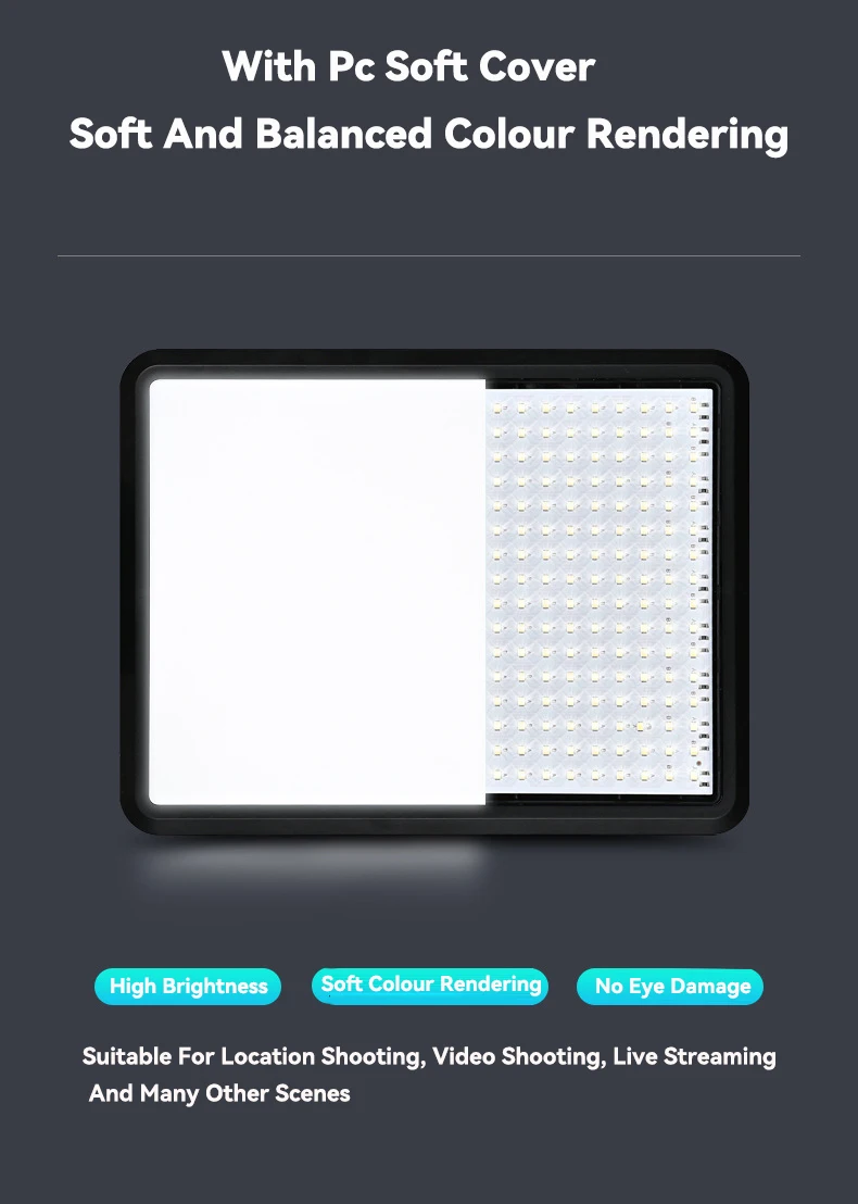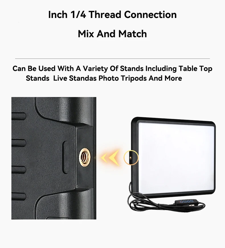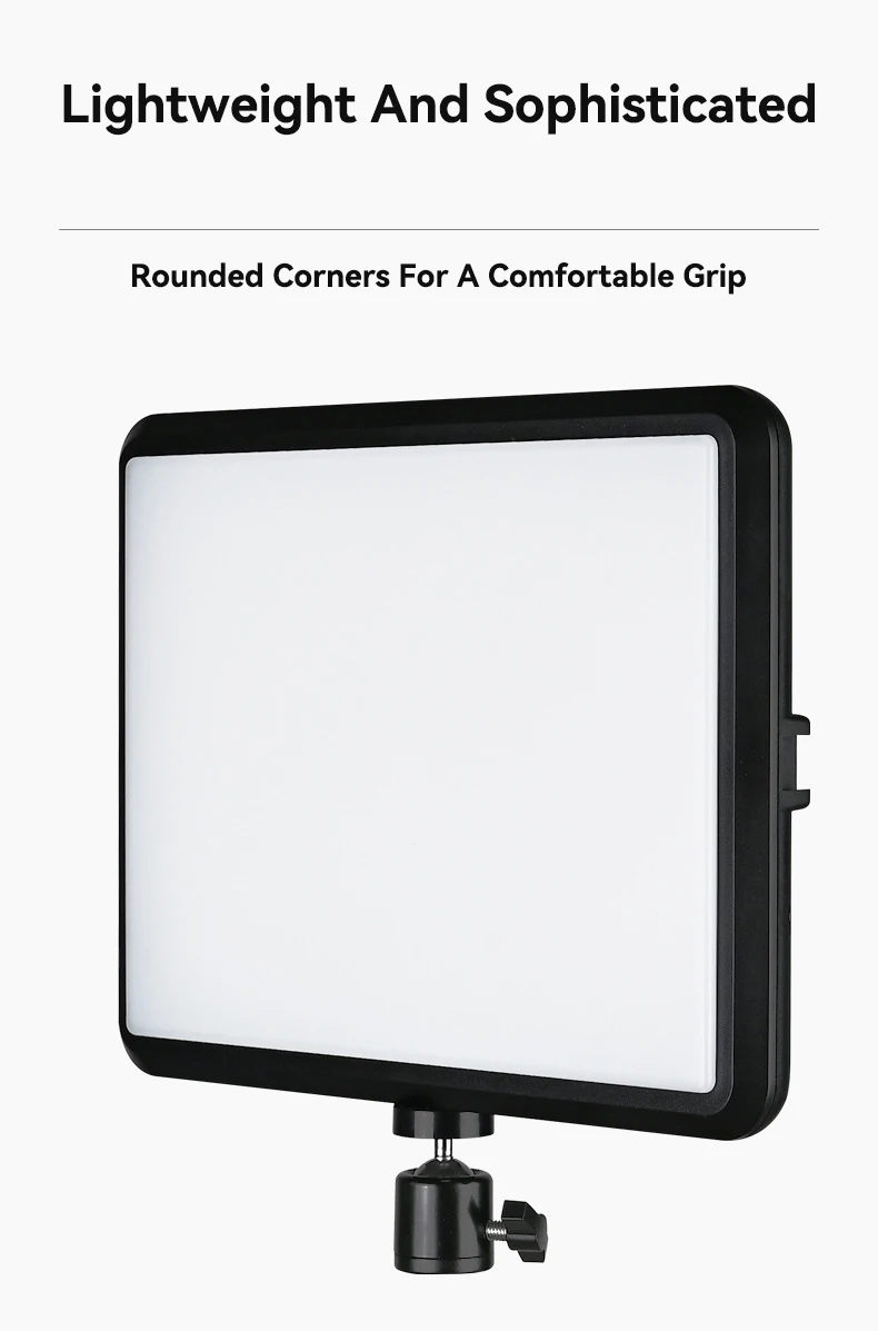 El panel de luz LED extendido con diseño compacto le permite transportarlo cómodamente con nuestra bolsa de almacenamiento duradera. El panel de luz extendido proporciona un área más grande de luz que será más suave. Puerto USB ideal para alimentar el dispositivo con cargador de pared de 5V, 2A CC o banco de energía. Viene con un adaptador que le permite alimentar el dispositivo con un teléfono móvil o portátil. No requiere ningún cargador independiente ni baterías adicionales, lo que ahorra tiempo al prepararse para el disparo.