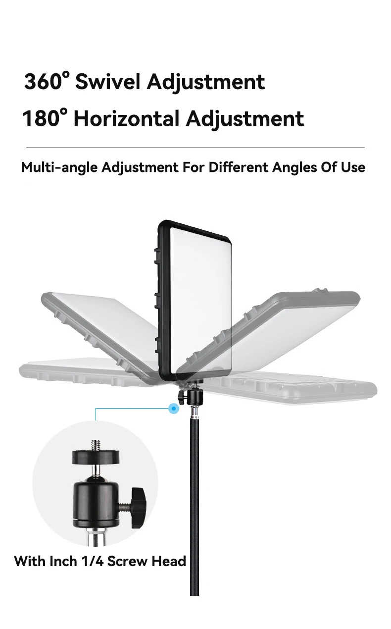 El trípode de la luz de vídeo adopta aluminio duradero pero liviano con capa de polvo pulverizado, se ve elegante y clásico. El soporte de luz se puede elevar hasta 61 ". Tamaño plegado 17 "", perfecto para almacenar y llevar. Ajuste la altura de forma flexible con 3 perillas de tornillo, afloje y apriete. Coloque y separe el panel de luz fácilmente con los hilos de 1/4 "en la parte superior del trípode. Afloje el tornillo en el lado para girar el ángulo del panel de luz en un rango de 180 °, apriételo cuando obtenga el ángulo adecuado.