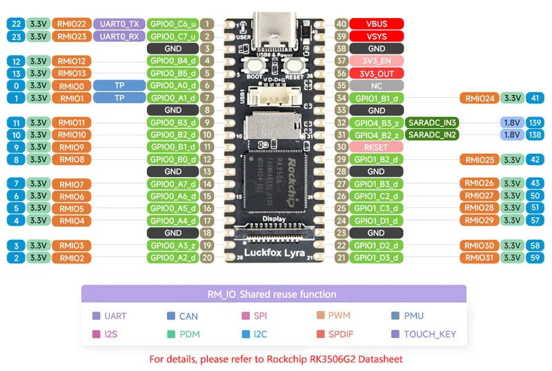 [] La interfaz de baja velocidad adopta el diseño Rockchip Matrix IO de Rockchip, que permite una variedad de funciones de multiplexación compartir pines de chip limitados, lo que hace que la adaptación del circuito periférico sea más flexible