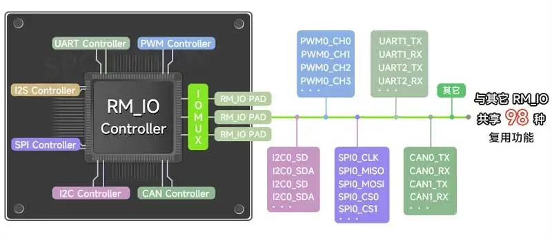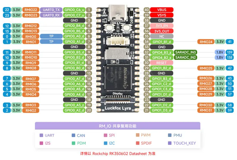 [] La interfaz de baja velocidad adopta el diseño Rockchip Matrix IO de Rockchip, que permite una variedad de funciones de multiplexación compartir pines de chip limitados, lo que hace que la adaptación del circuito periférico sea más flexible