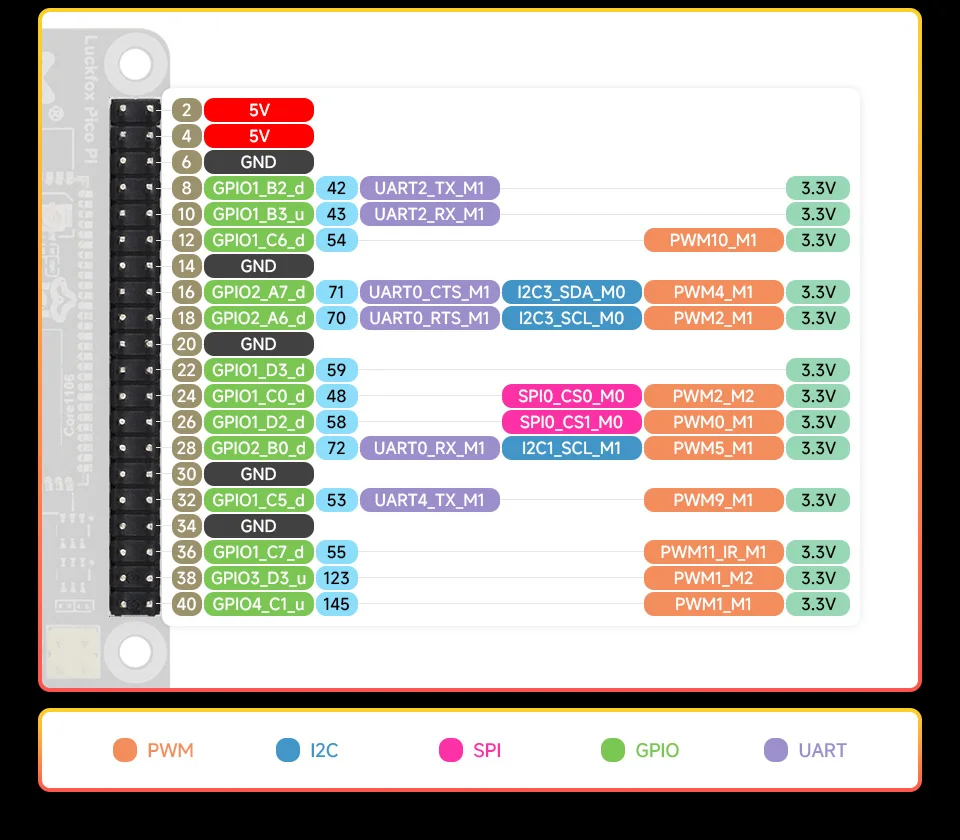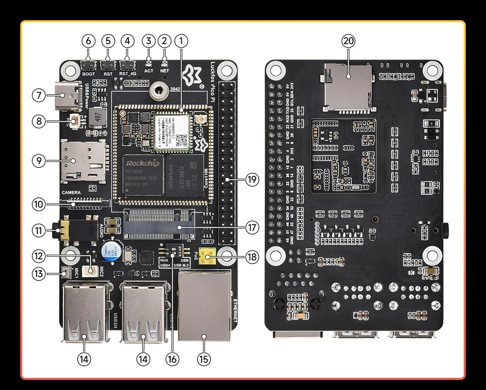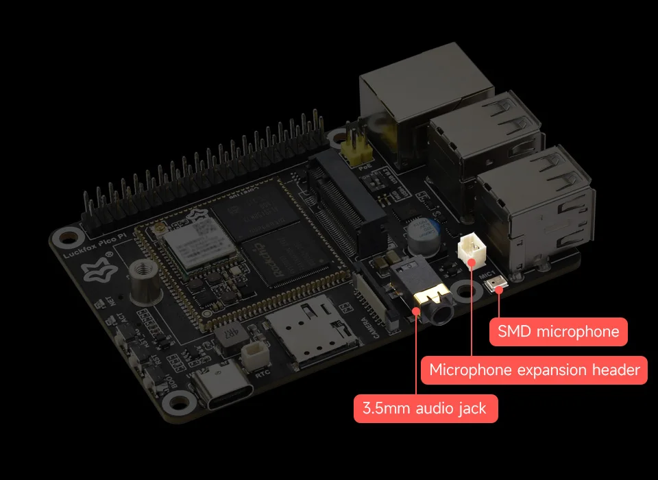 ElLuckfox Pico Pies una placa de microdesarrollo Linux rentable, basada en el chip Luckfox Core1106 para proporcionar una plataforma de desarrollo simple y eficiente para los desarrolladores.Admite una variedad de interfaces que incluyen MIPI CSI, GPIO, UART, SPI, I2C, USB y una ranura M.2 para módulo 4G, etc., lo cual es ideal para una amplia gama de aplicaciones integradas.
