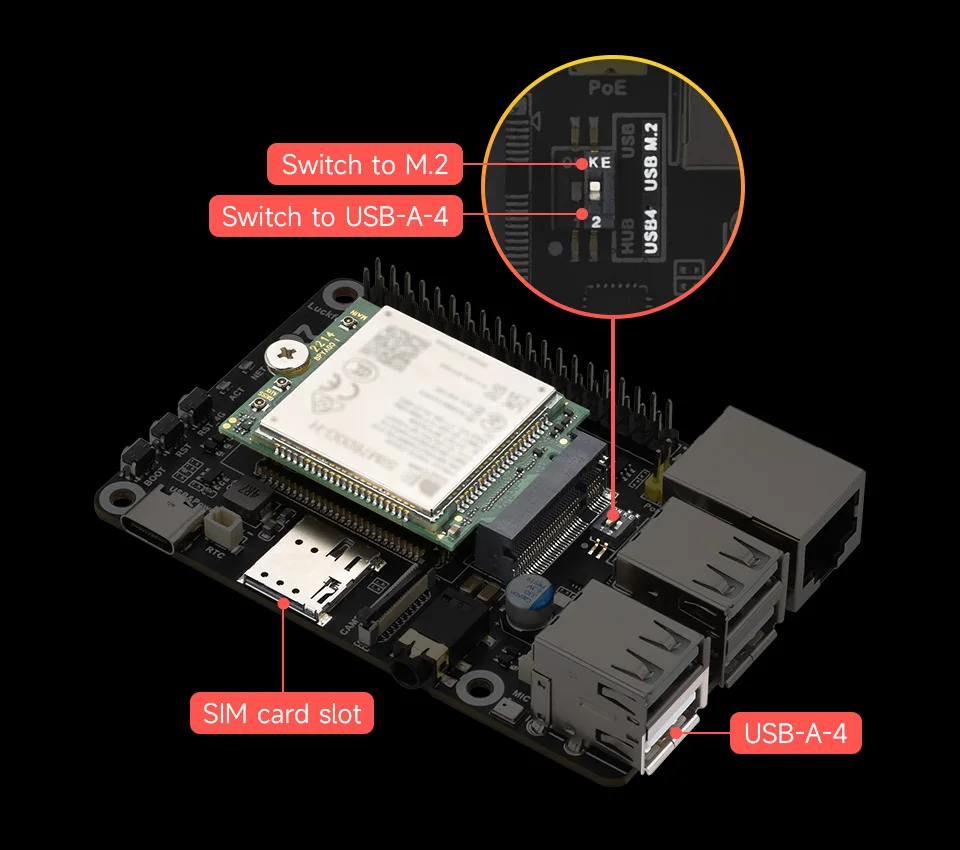 El puerto USB-A-4 se puede cambiar a la ranura M.2 del módulo 4G a través del interruptor DIP, admite el módulo SIM7600G-H-M.2 4G
