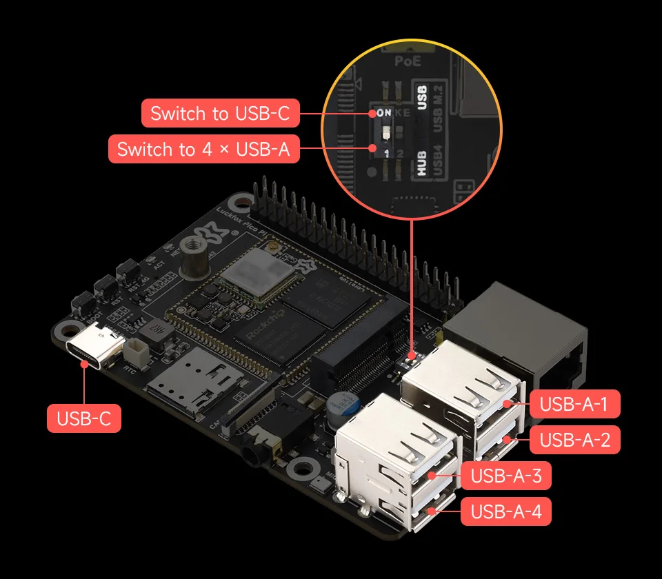 Conmutación flexible de puertos USB-C / 4 × USB-A HOST a través de un interruptor DIP