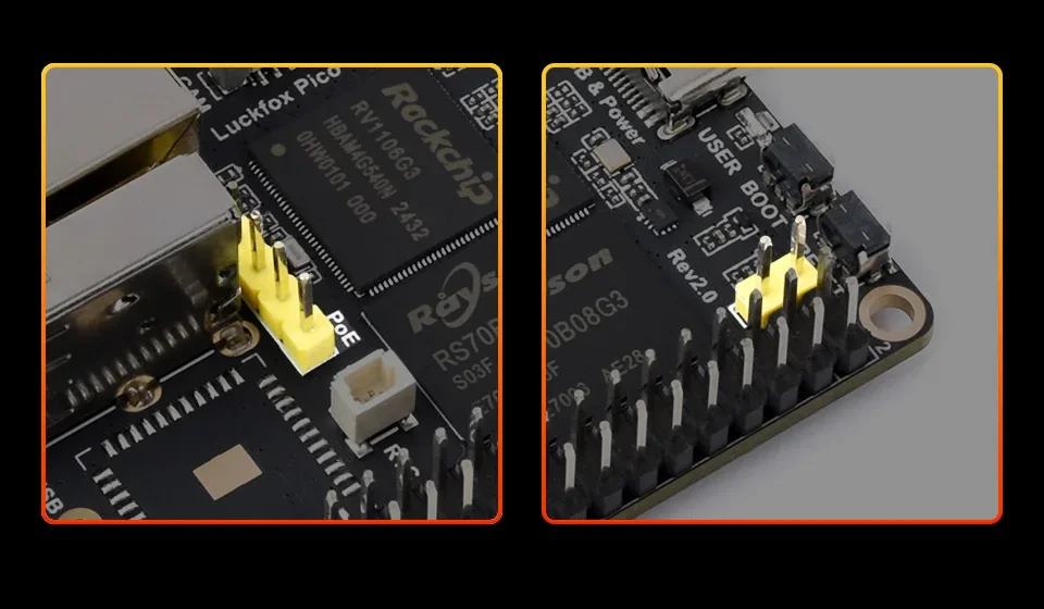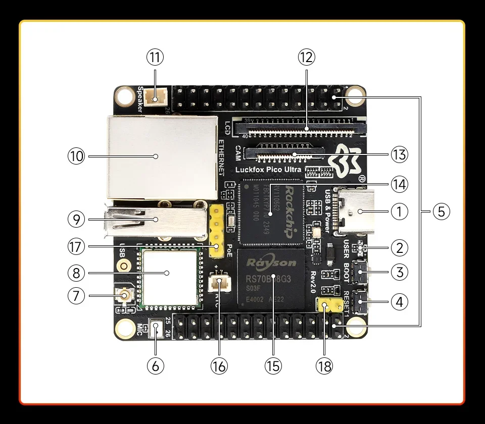 Puerto tipo C integrado, interfaz MIPI CSI, GPIO, puerto Ethernet, encabezado de batería RTC, etc.