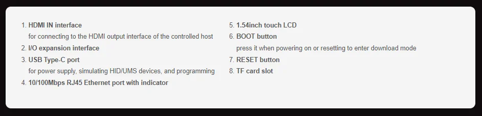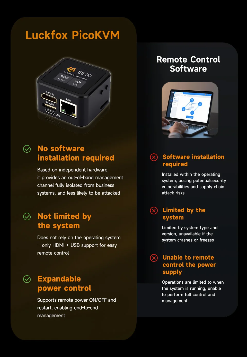 El Luckfox PicoKVM es una herramienta de administración KVM IP liviana que admite captura de video en tiempo real y simulación de entrada HID a través de la red, lo que permite el funcionamiento sin contacto de placas de desarrollo, PC y servidores.Este producto ofrece capacidades de control remoto y captura de video estables y de baja latencia, ampliamente adecuadas para escenarios como control remoto de PC y mantenimiento de servidores.