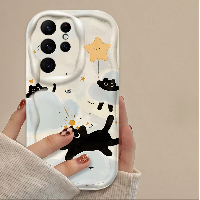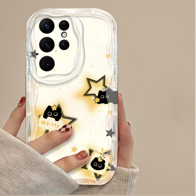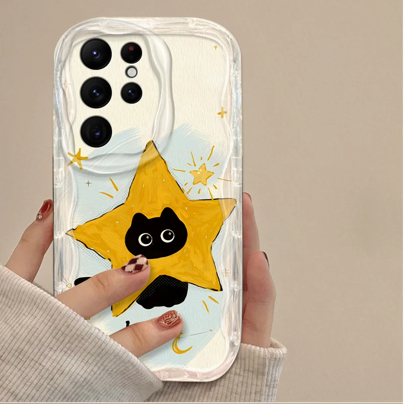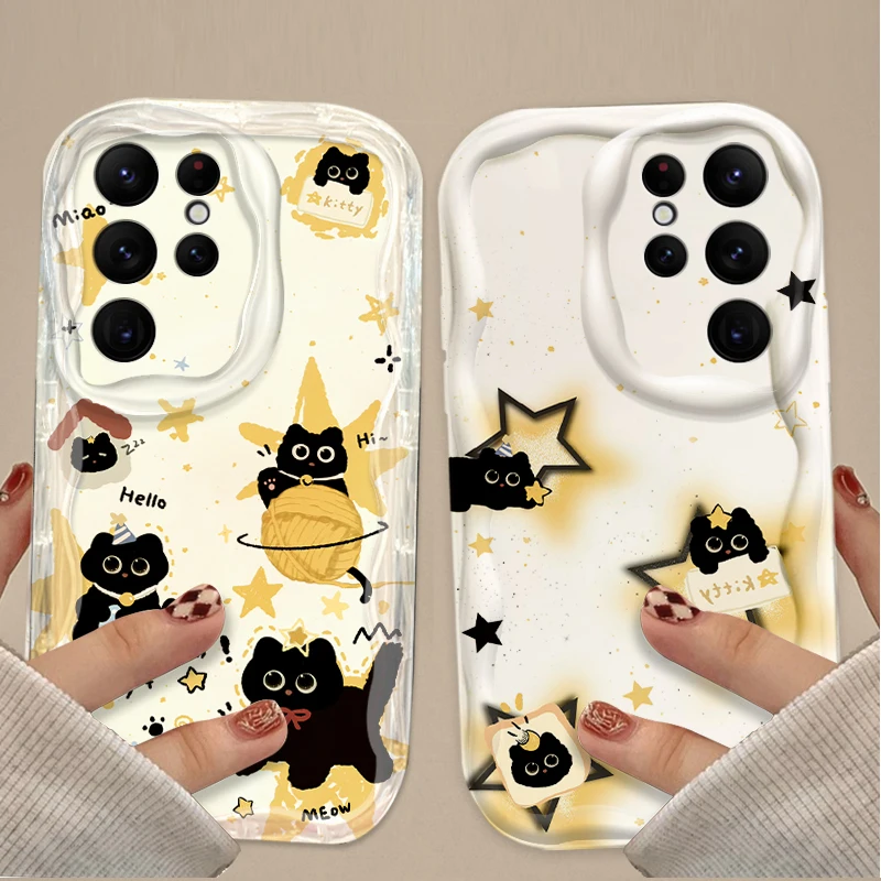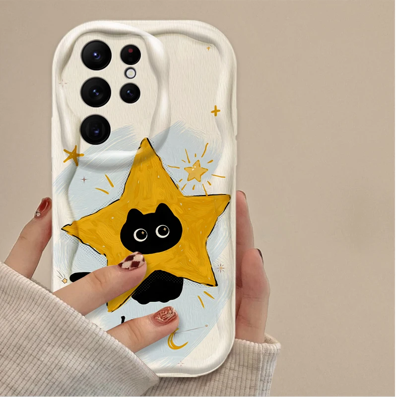 Lucky Star Cat 3D Wave Case para Samsung Galaxy S24 Ultra S23 S22 Plus S21 S20 FE A25 A55 A35 A15 A16 A05 A05S A06, Etui de silicona