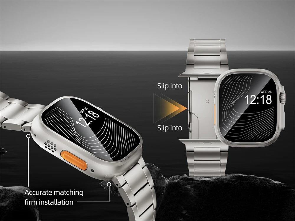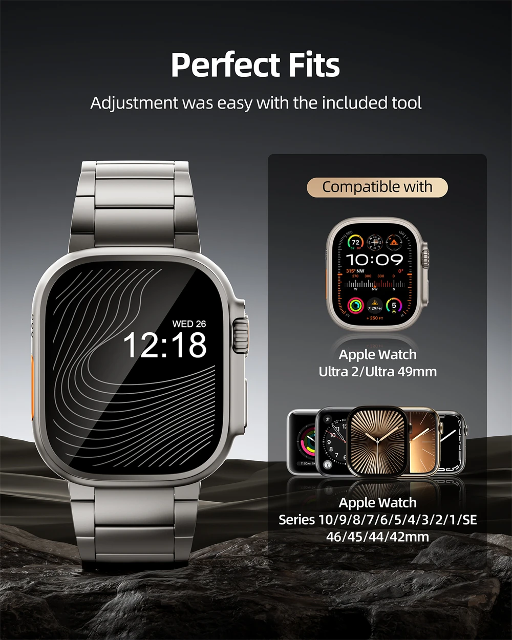 Diseñado para usted: Diseñado para integrarse perfectamente con Apple Watch Ultra 3 (49 mm), Apple Watch Ultra 2 (49 mm), Ultra (49 mm) y Serie 11 de 46 mm, Serie 10 de 46 mm, nuestra correa de titanio para Apple Watch presenta una conexión sin espacios para un ajuste seguro y al ras.Combina perfectamente con el Watch ULTRA sin espacio entre la interfaz de la correa y la esfera del reloj.También compatible con Apple Watch SE/SE 2/SE 3 de 44 mm, serie 6/5/4 de 44 m, Apple Watch S9/8/7 de 45 mm y S3/2/1 de 42 mm.