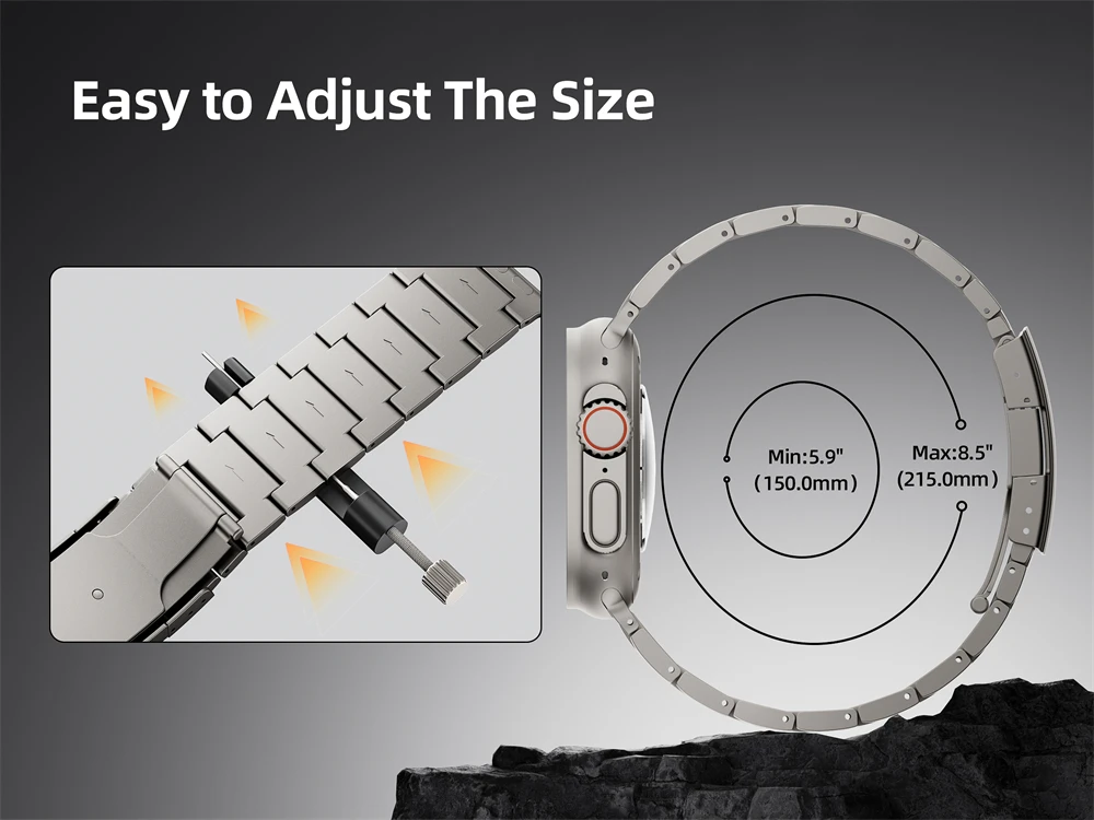 Fácil ajuste de longitud: esta correa de titanio de 24 mm de ancho para Apple Watch Ultra ofrece un ajuste personalizable para tamaños de muñeca que oscilan entre 150 y 215 mm (5,9 y 8,5 pulgadas).Viene con una práctica herramienta de enlace extraíble, lo que facilita ajustar la correa en solo unos minutos para un ajuste cómodo y personalizado.