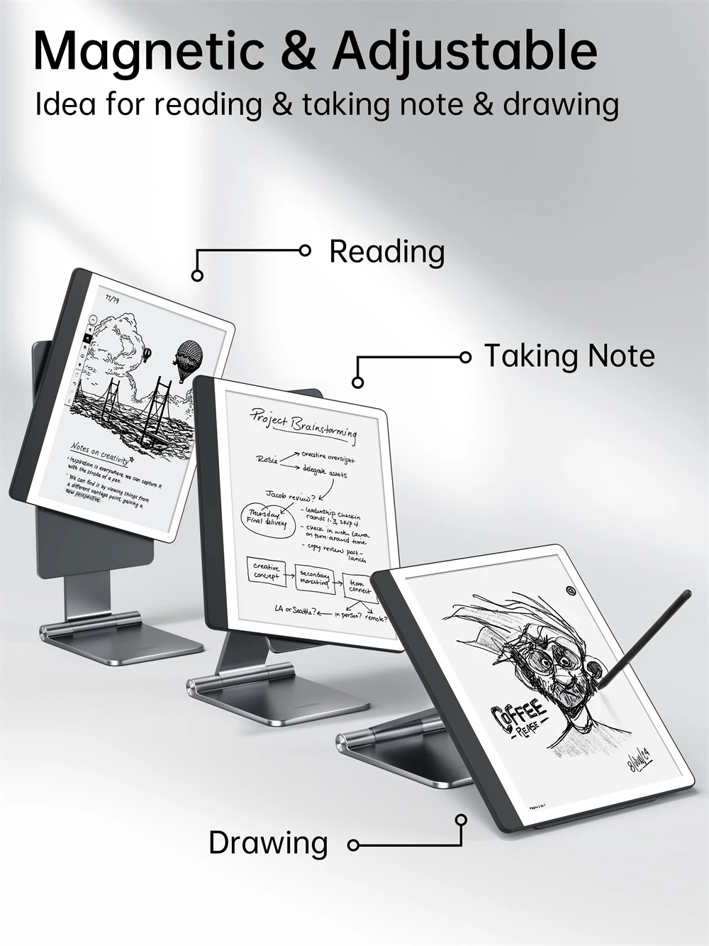 Nuestra serie de soportes magnéticos ahora es adecuada paraKindle Scribe 10.2.Soporte magnético flotante moderno especialmente diseñado paraKindle Scribe 2022 y nuevo Kindle Scribe 2024.Aluminio refinado con diseño ajustable, nuestro soporte magnético mantiene su Kindle Scribe en su lugar de forma segura, ideal para tomar notas, escribir y leer.