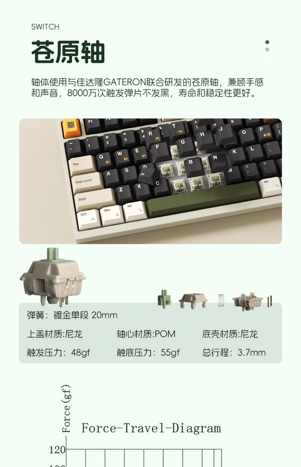 El cuerpo del eje utiliza el eje Cangyuan desarrollado conjuntamente con GATERON, teniendo en cuenta la sensación y el sonido, y los estriles activados 80 millones de veces no se ennegrecen, tienen una mejor vida útil y estabilidad.