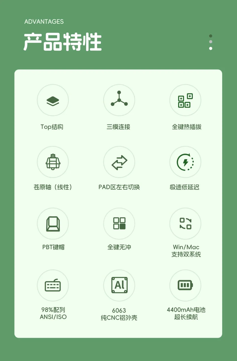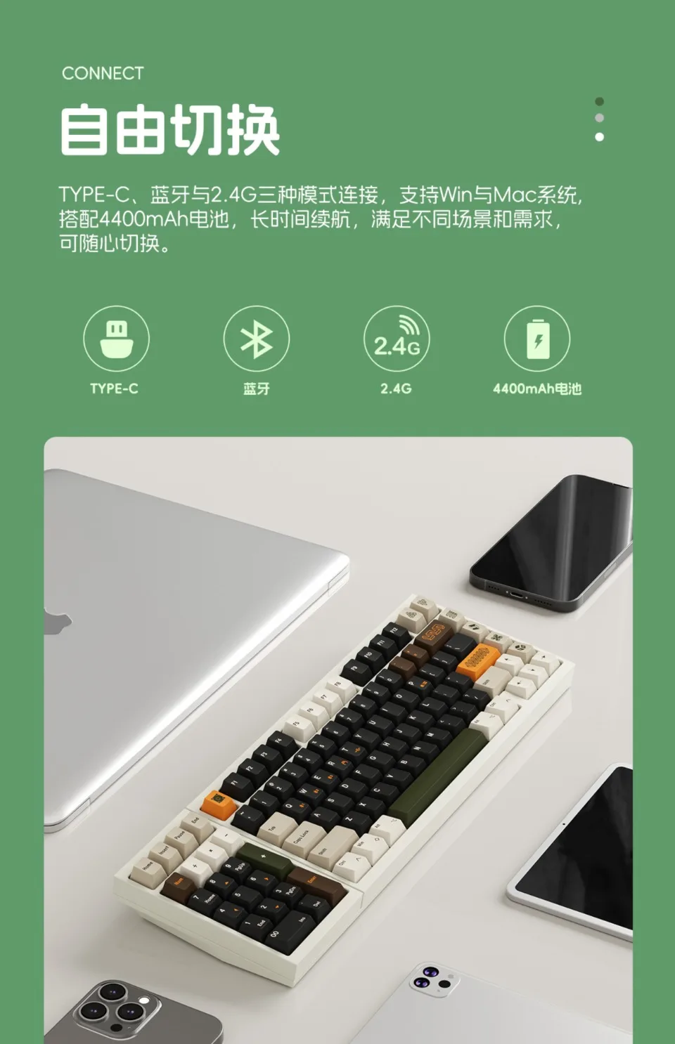 1.TYPE-C, Bluetooth y 2,4G tres modos de conectividad, compatible con sistemas Win y Mac, con batería de 4400 mAh, batería de larga duración, para satisfacer diferentes escenarios y necesidades, se puede cambiar a voluntad.