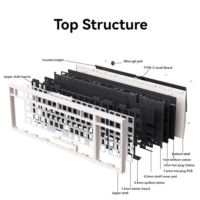 6.La carcasa del teclado está hecha de aleación de aluminio CNC, coloración anódica, tacto delicado, colores brillantes, soporte para intercambio en caliente de teclas completas y pesos personalizados en la parte posterior.