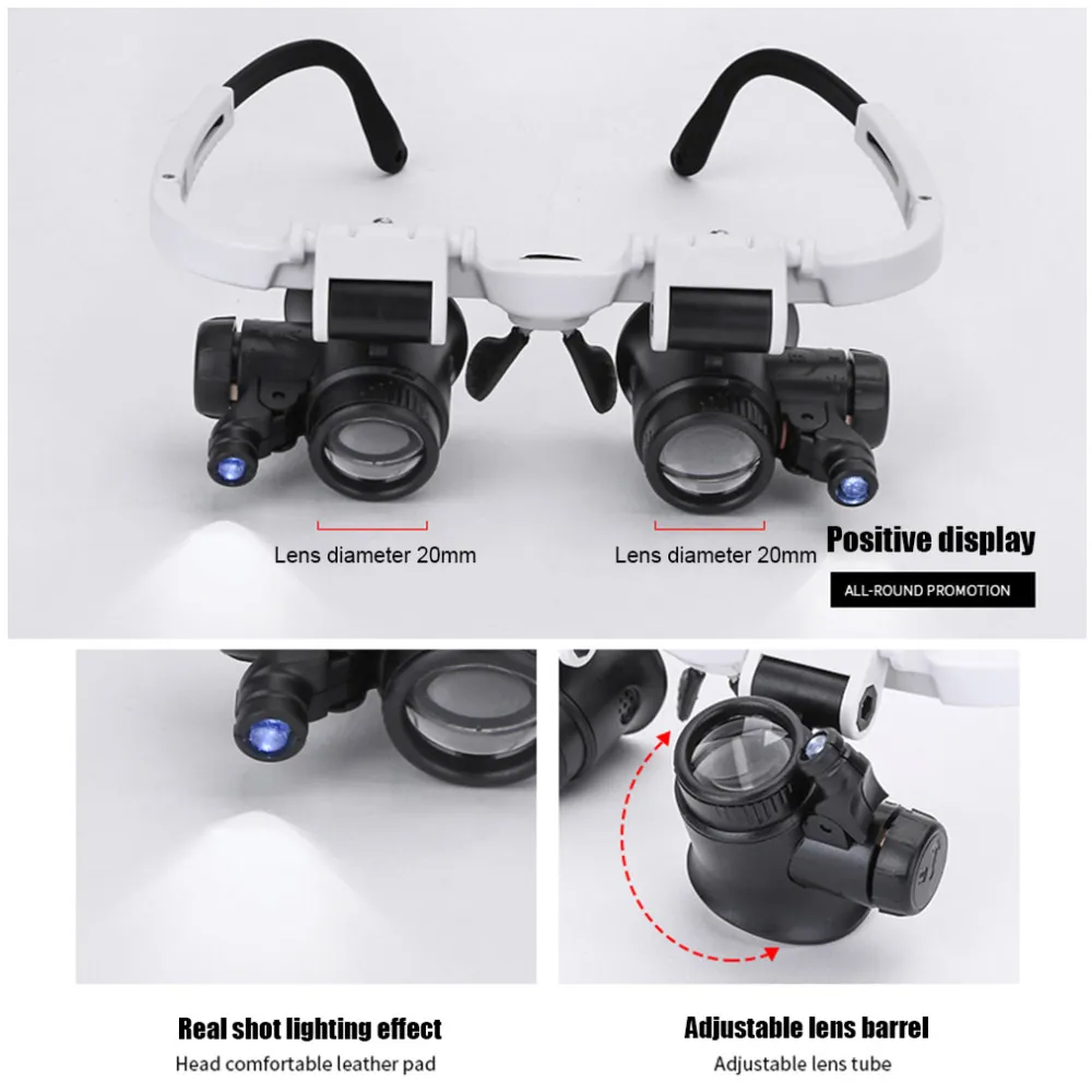 5. La máscara de ojos se puede mover a izquierda y derecha, y se puede girar hacia arriba y hacia abajo 180 grados. Lupa binocular izquierda y derecha, lupa con LED ajustable.