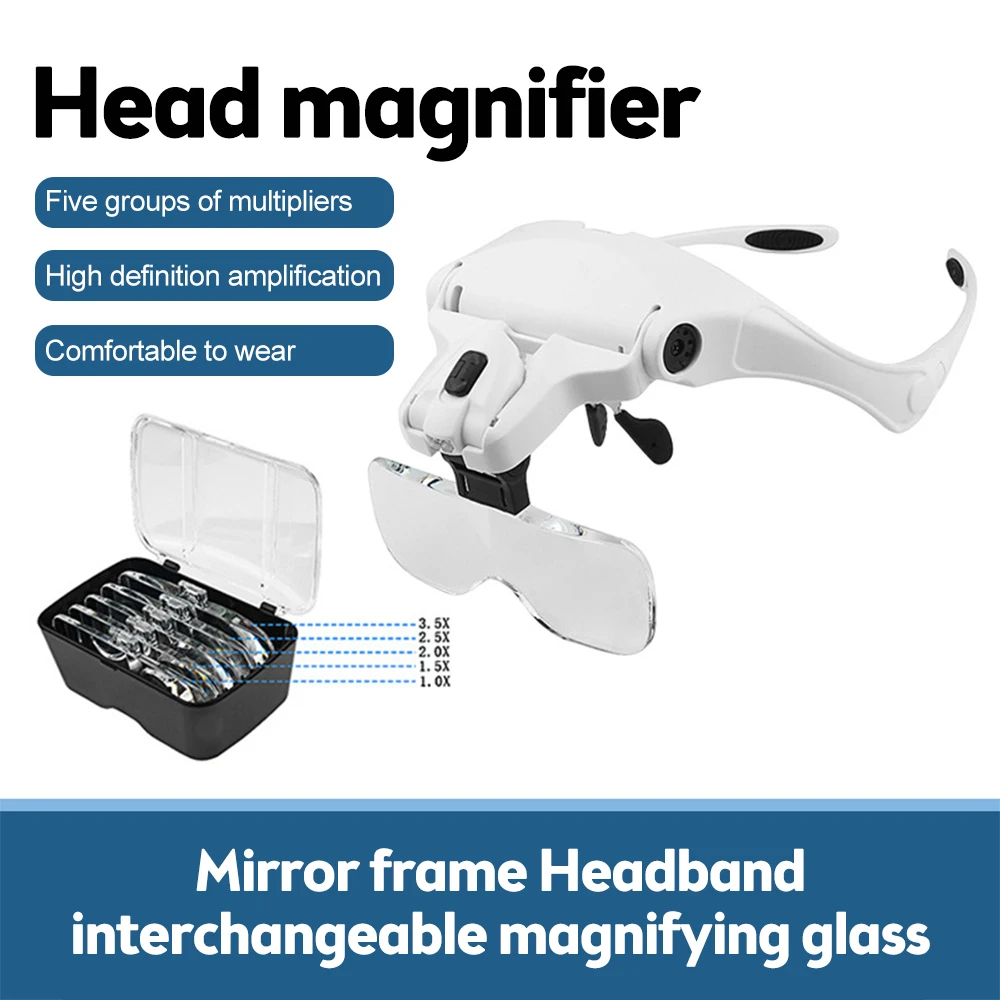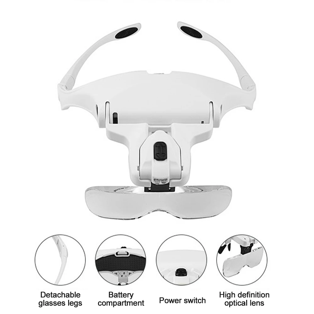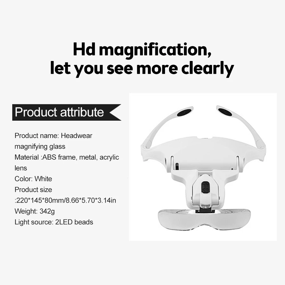 2. Excellent product for watch manufacturing and repair industry, especially for inspecting those tiny parts3. Interchangeable lens design: Switch between 5 optical lenses using a simple click-and-release system. Head magnification: 1.0X, 1.5X, 2.0X, 2.5X, 3.5X. Anti-scratch acrylic reduces weight.4. Adjustable brightness levels: There are two levels of brightness that provide excellent light for illuminating detailed surfaces. Press the switch at the top of the headset magnifier to obtain two brightness levels.5. Comfort and ease of use: Comfortable frame with rubber nose plate. Choose between wearing glasses or a headband. The included headband can be easily attached to ensure a firmer fit.Parameters:[Product material] : plastic metal acrylic lens[Color] : Black + white[magnification] : 1.0 times 1.5 times 2.0 times 2.5 times 3.5 times[Product size] : 220*145*80mm/ color box 230*150*66MM[Product battery] : 3 No.7 batteries (not included in factory)[Product weight] : 342g (including packaging)Package includes:1* Head mounted magnifier with LED5* lens1* glasses cloth