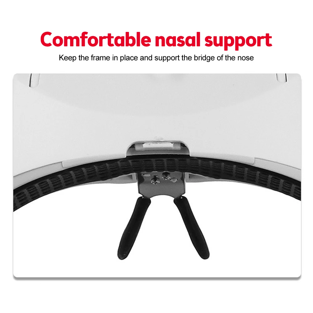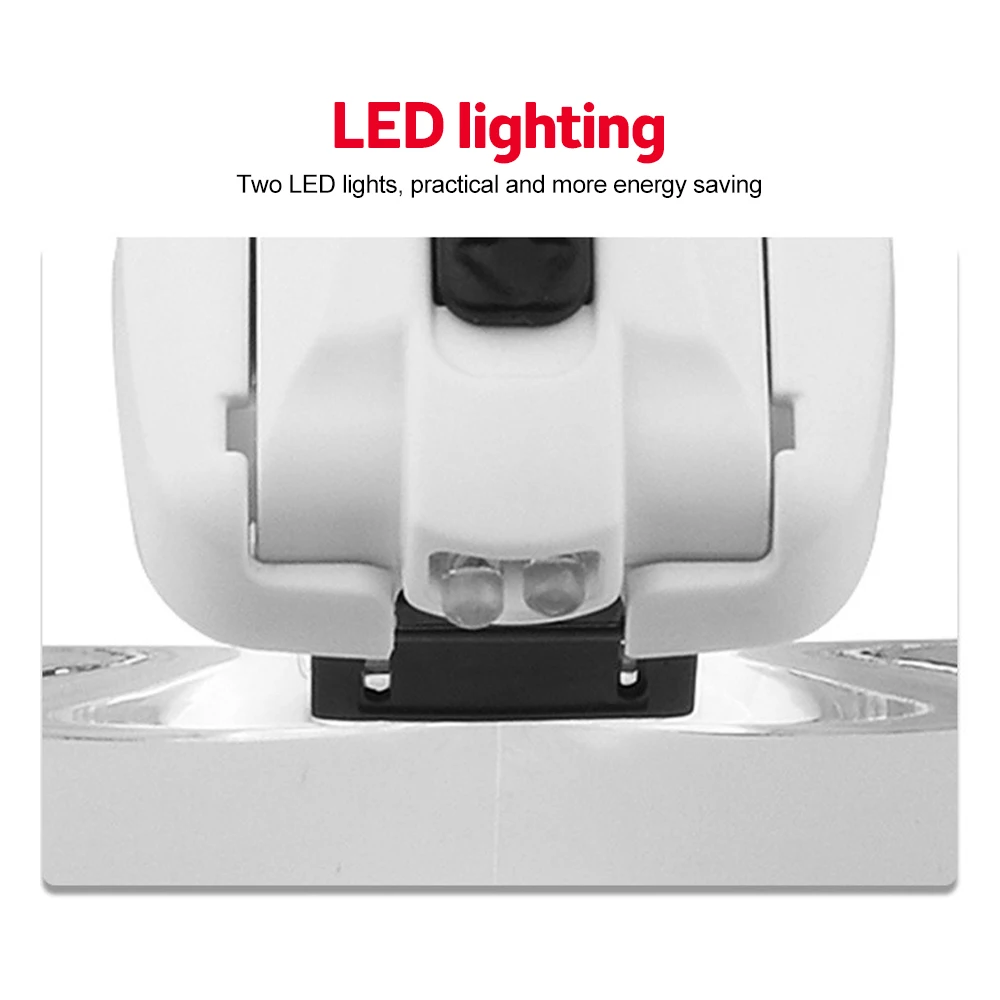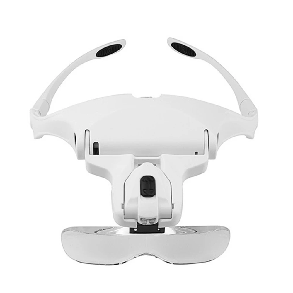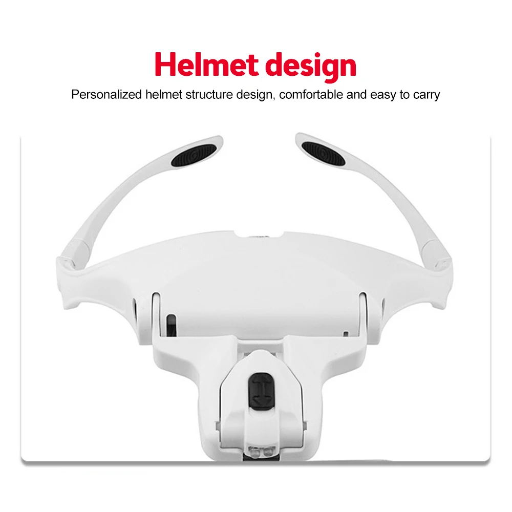 2. Excellent product for watch manufacturing and repair industry, especially for inspecting those tiny parts3. Interchangeable lens design: Switch between 5 optical lenses using a simple click-and-release system. Head magnification: 1.0X, 1.5X, 2.0X, 2.5X, 3.5X. Anti-scratch acrylic reduces weight.4. Adjustable brightness levels: There are two levels of brightness that provide excellent light for illuminating detailed surfaces. Press the switch at the top of the headset magnifier to obtain two brightness levels.5. Comfort and ease of use: Comfortable frame with rubber nose plate. Choose between wearing glasses or a headband. The included headband can be easily attached to ensure a firmer fit.Parameters:[Product material] : plastic metal acrylic lens[Color] : Black + white[magnification] : 1.0 times 1.5 times 2.0 times 2.5 times 3.5 times[Product size] : 220*145*80mm/ color box 230*150*66MM[Product battery] : 3 No.7 batteries (not included in factory)[Product weight] : 342g (including packaging)Package includes:1* Head mounted magnifier with LED5* lens1* glasses cloth