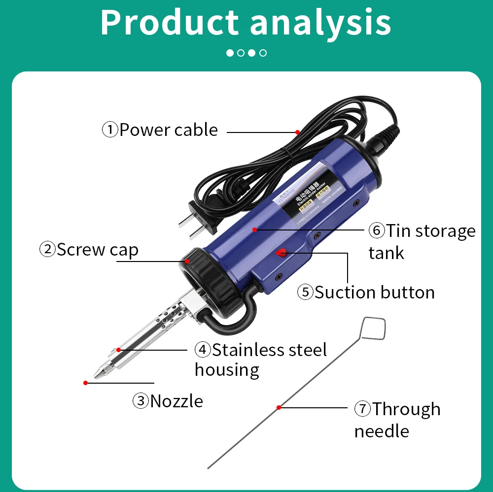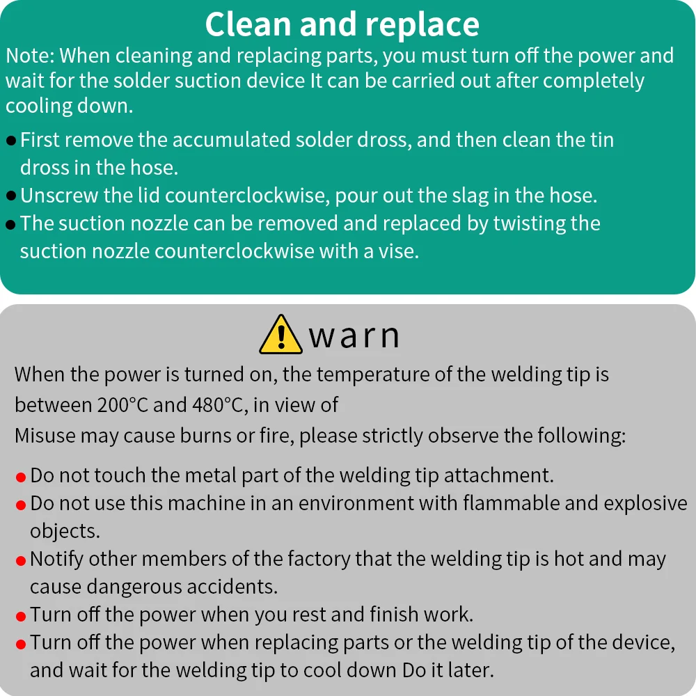 Note: When cleaning and replacing parts, you must turn off the power and wait for the solder suction device