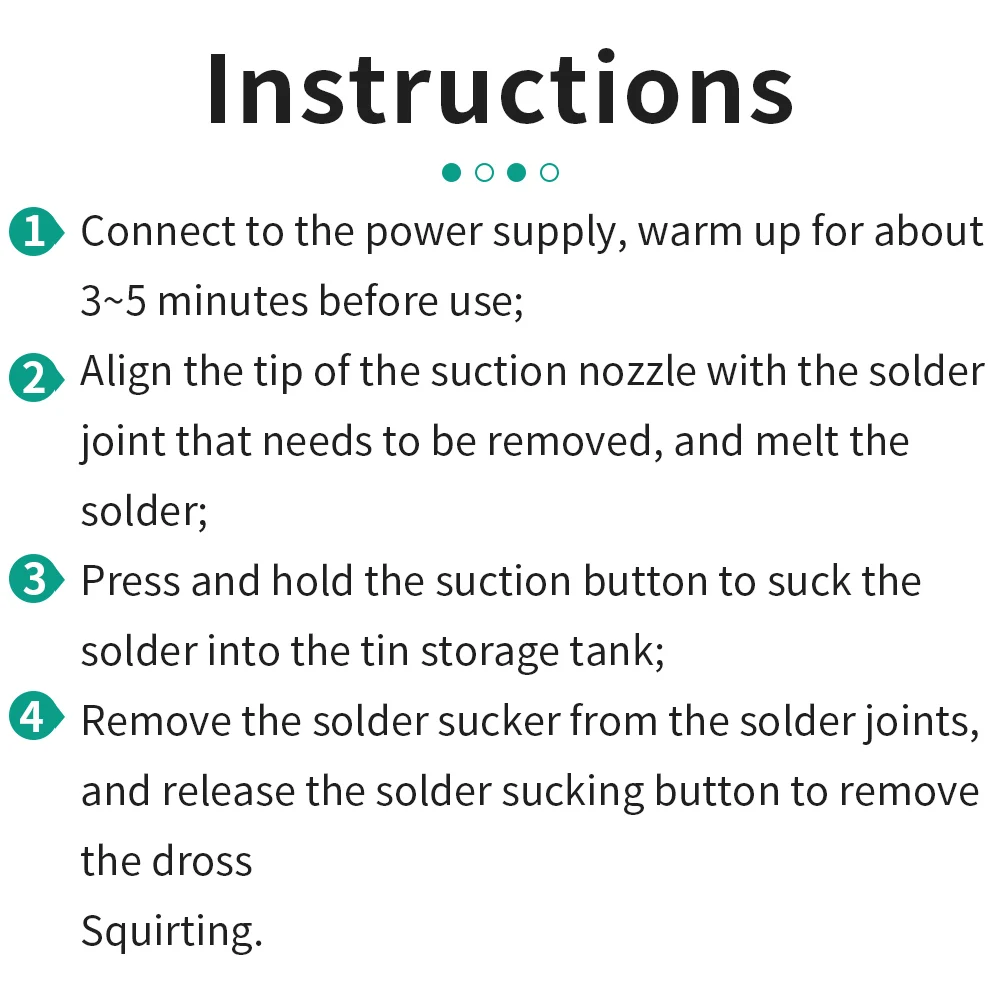 3.Press and hold the suction button to suck the solder into the tin storage tank;