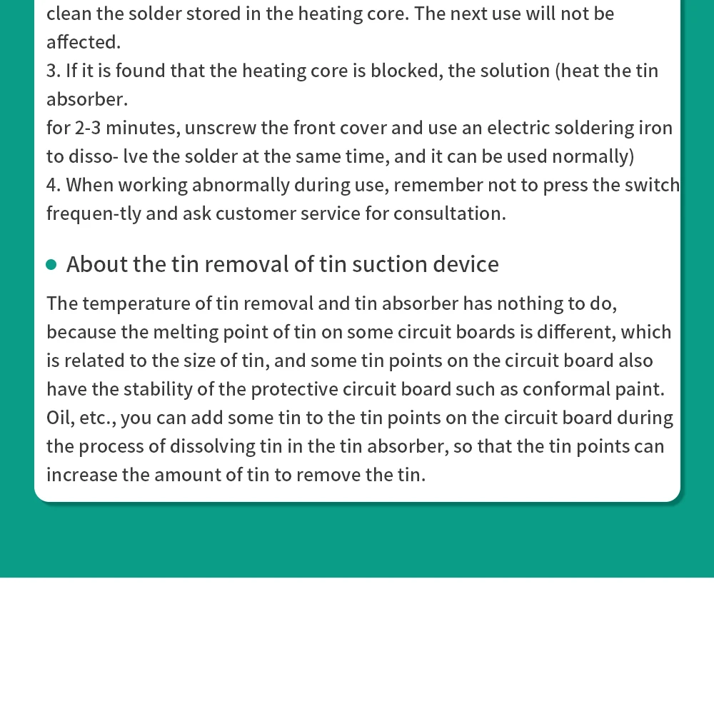 3.If it is found that the heating core is blocked, the solution: heat the tin suction device for 2-3 minutes.Unscrew the front cover and use an electric soldering iron to dissolve the solder while heating, and it can be used normally.