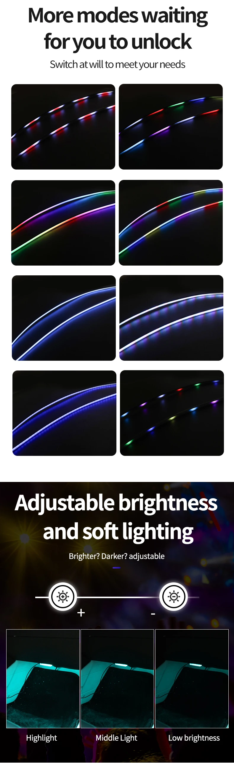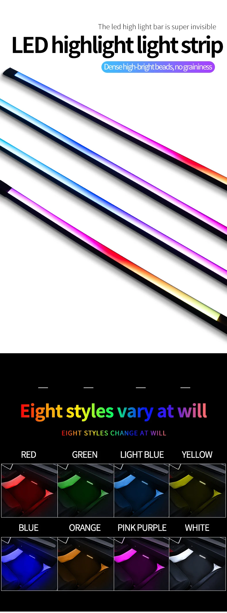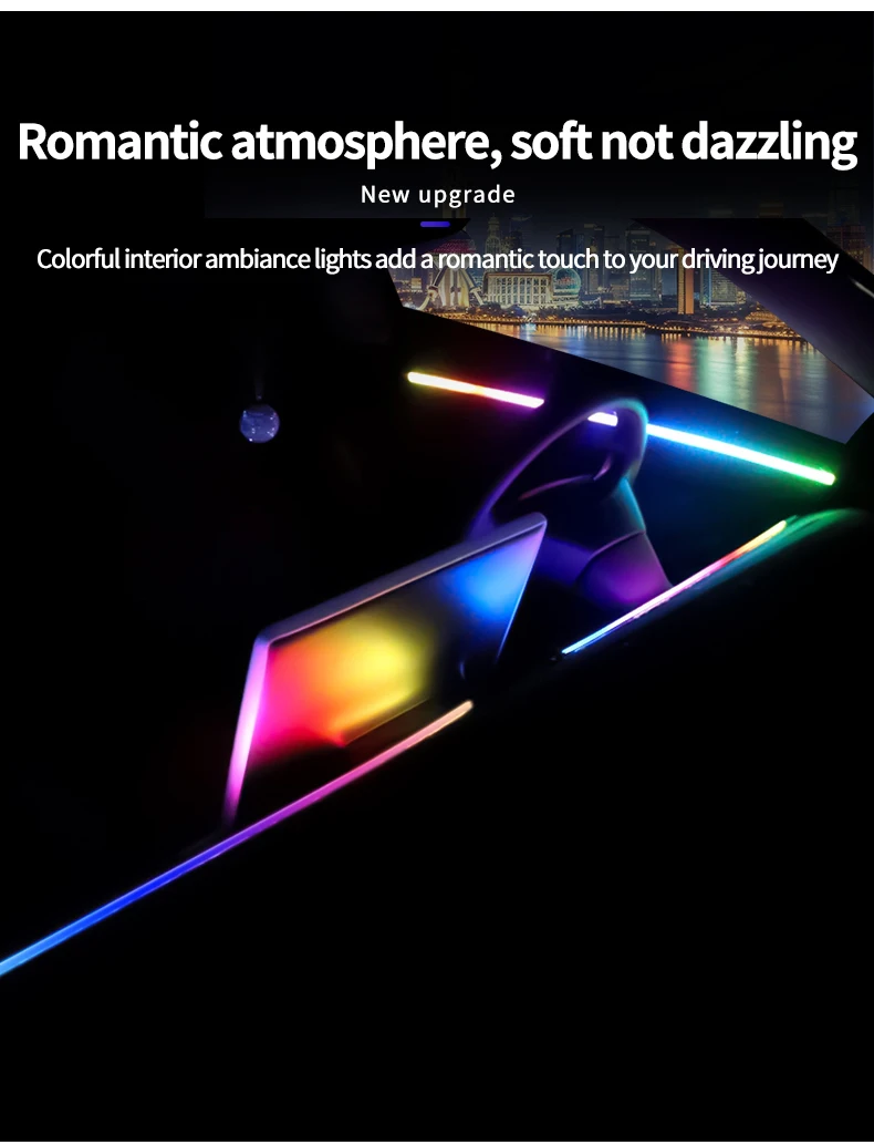 Control inteligente: el control de la aplicación facilita cambiar el color, el brillo, el modo de música y el modo de control de sonido, lo que le permite cambiar el patrón siguiendo su voz, así como el ritmo de la música estéreo del automóvil.