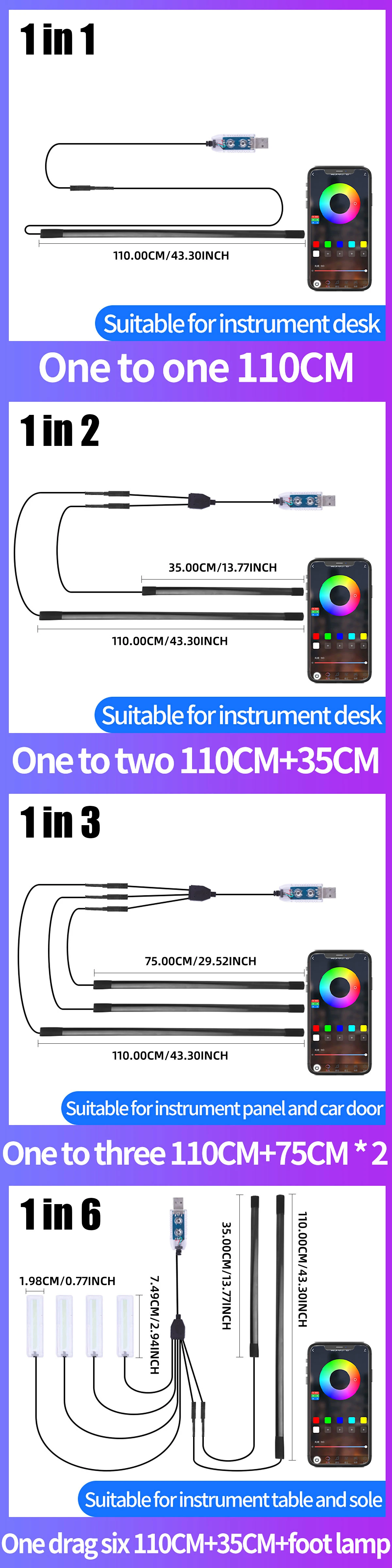 1 pulgada 6 adecuado para panel de instrumentos + suela: 1 tira LED 110cm + 1 tira LED 35cm + Luz De pie + USB