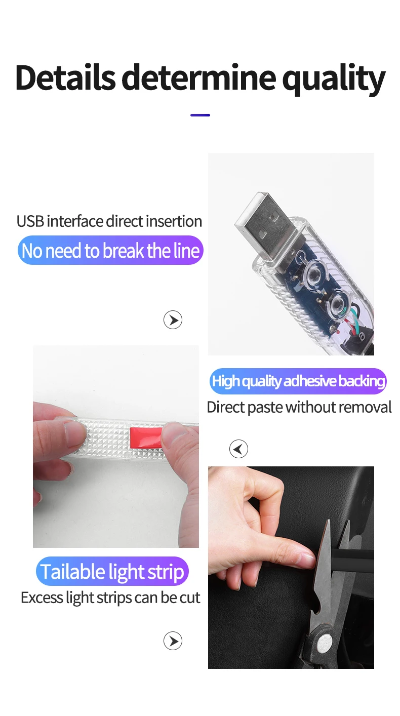 1 pulgada 3 adecuado para panel de instrumentos + puerta: 1 tira LED 110cm + 1 tira LED 75CM * 2 + USB