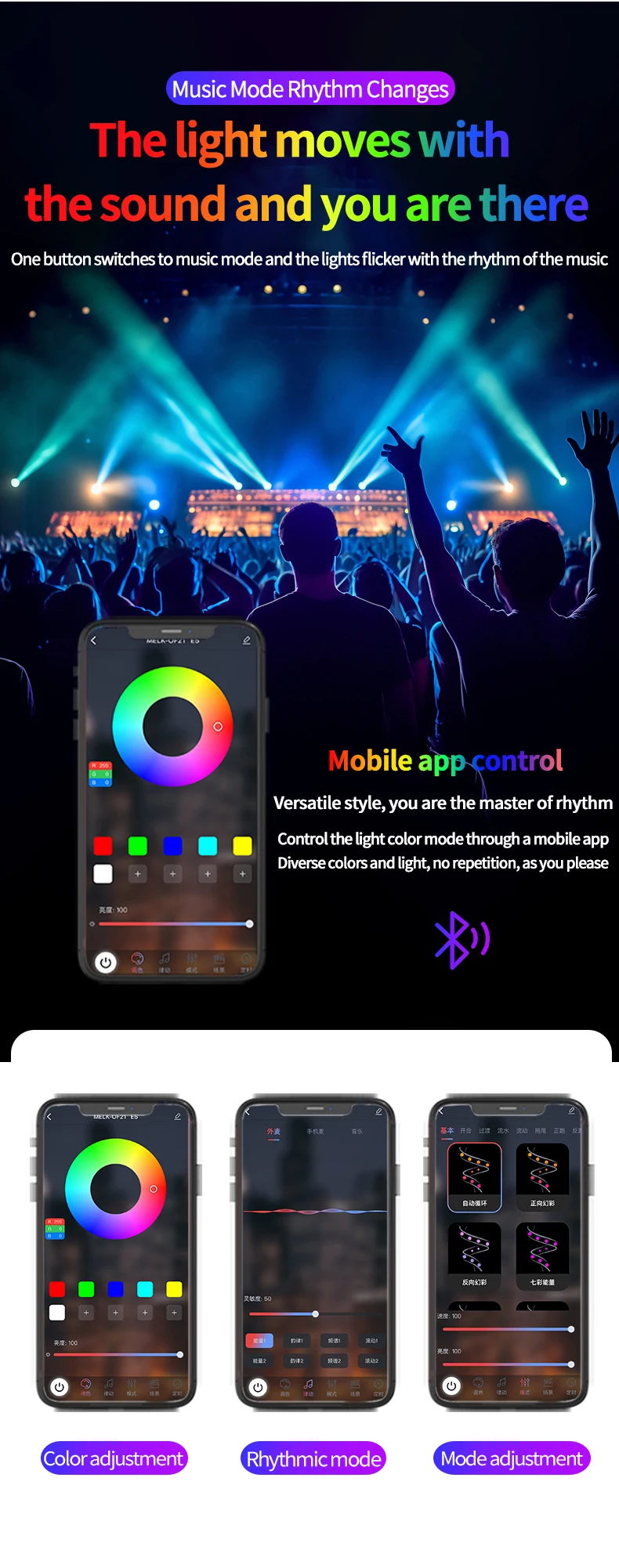 Control de APP, más fácil de controlar la luz en cualquier momento y en cualquier lugar; Control de sonido musical, creando un ambiente alegre y relajante.