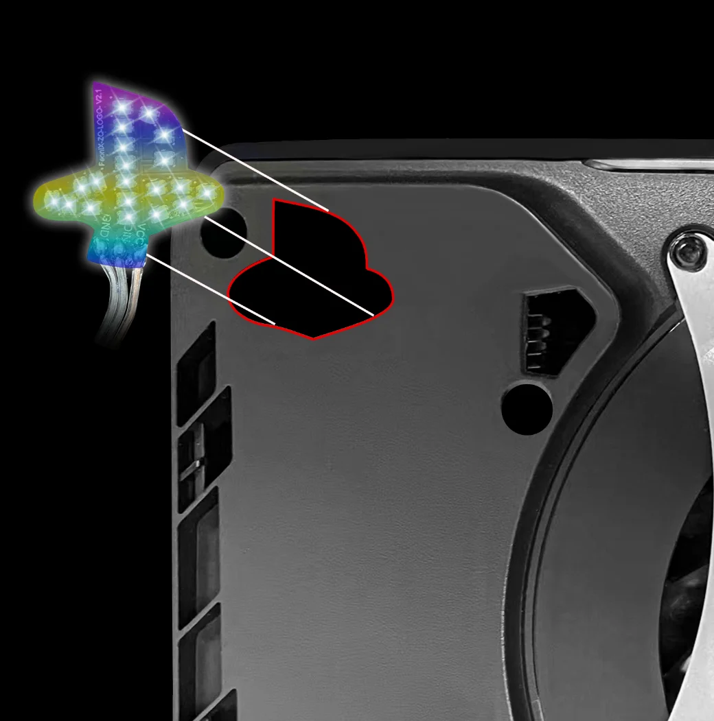 Operación de instalación: la tira de luz abre la pegatina adhesiva posterior, pégala en la posición del logotipo del host P5; Hoja de transmitancia de luz pegada en la posición del logotipo de la carcasa (puede elegir no usar)