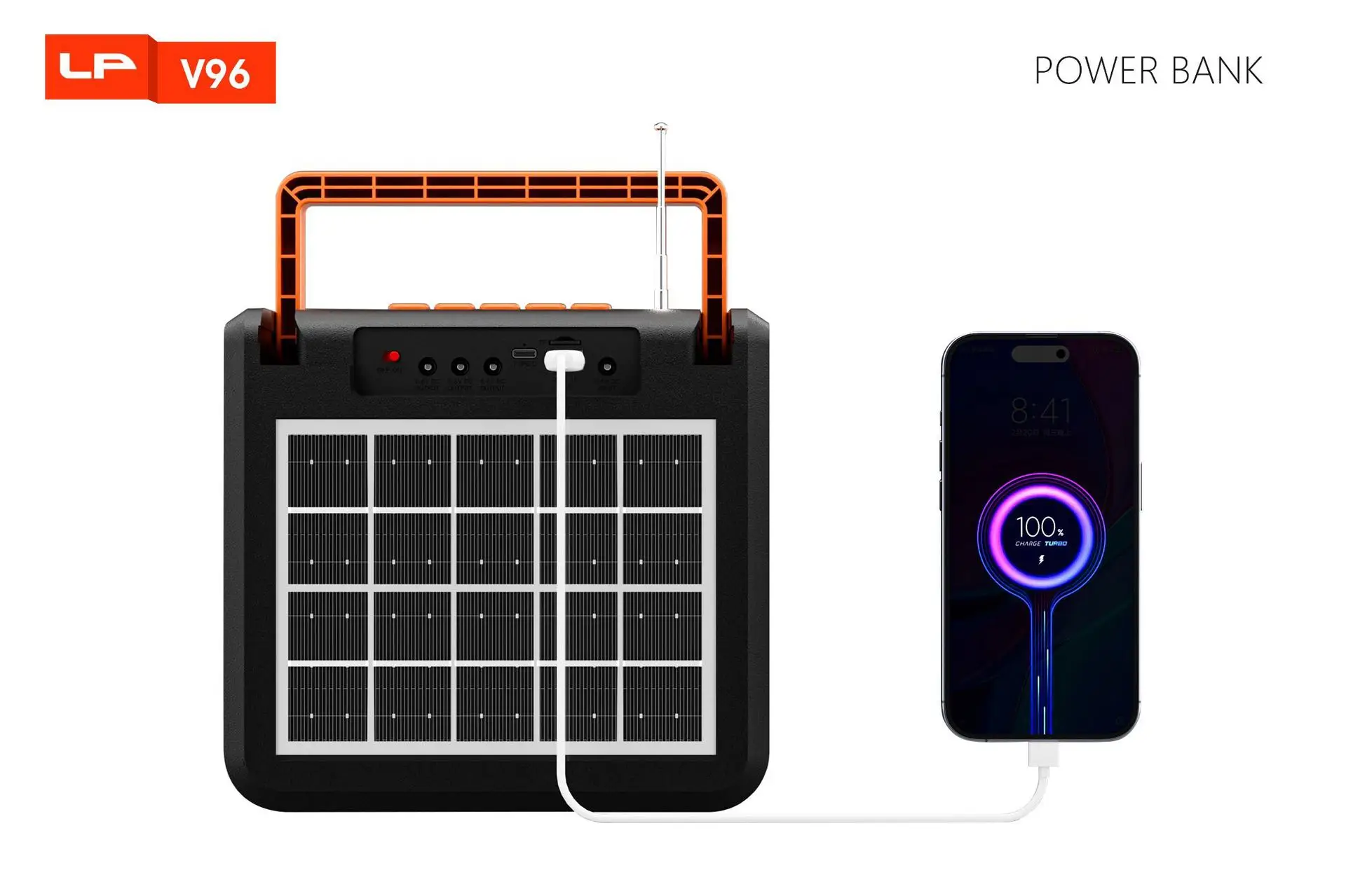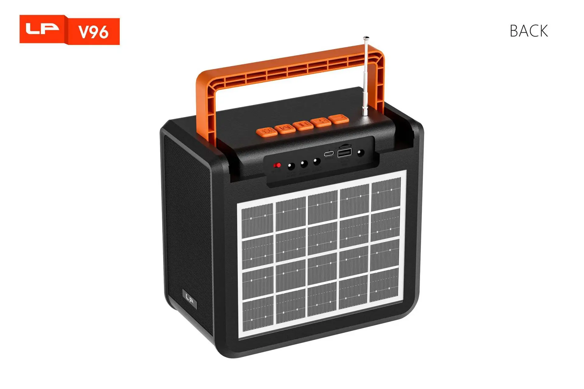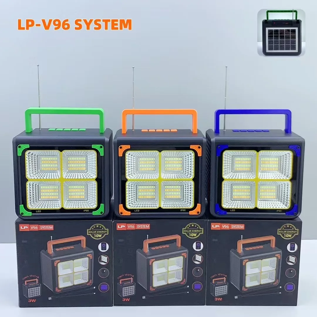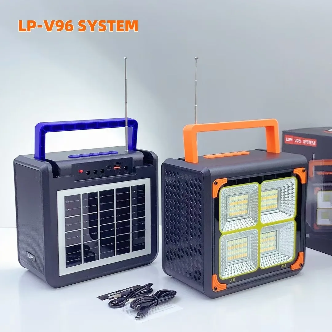 1: Altavoz de 3 pulgadas y 10 W + antena externa + batería de 4500 LED mAh + soporte para carga de teléfonos móviles + mango grande + panel solar de vidrio + lámpara de iluminación + carga tipo C + salida de CC.