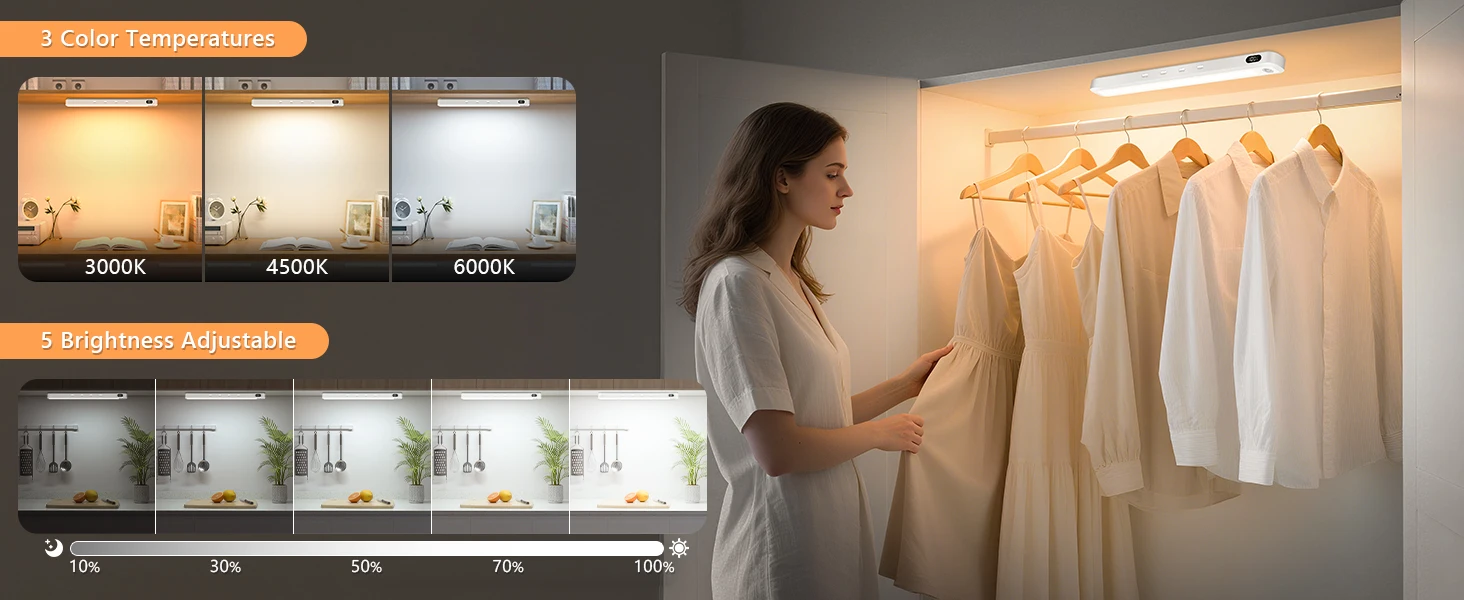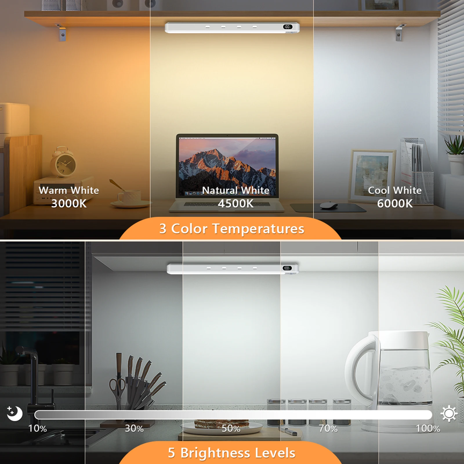 3 temperaturas de color y 5 niveles de brillo: nuestras luces debajo del gabinete ofrecen 3 temperaturas de color versátiles (3000 K de blanco cálido, luz natural de 4500 K y blanco frío de 6000 K) y 5 niveles de brillo ajustables