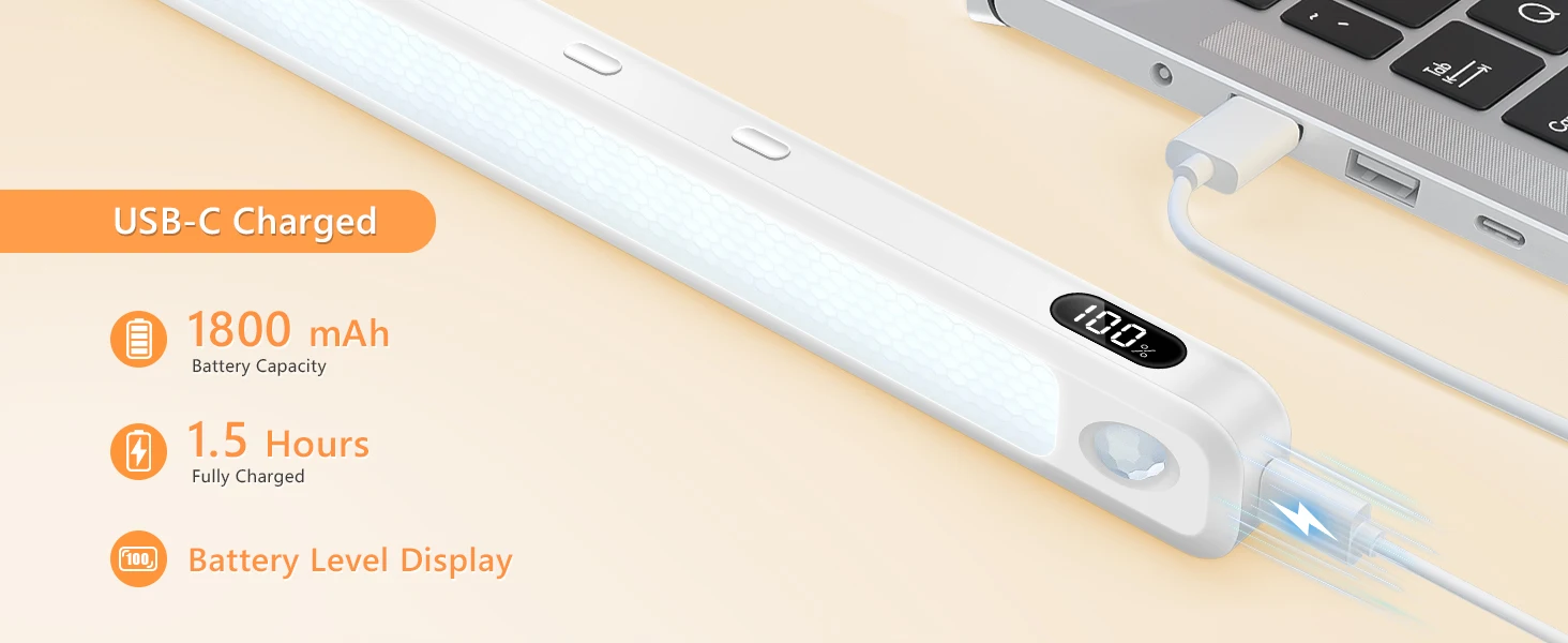 Esta luz con sensor de movimiento debajo del gabinete es recargable tipo C, cárguela a tiempo para evitar dañar la batería.