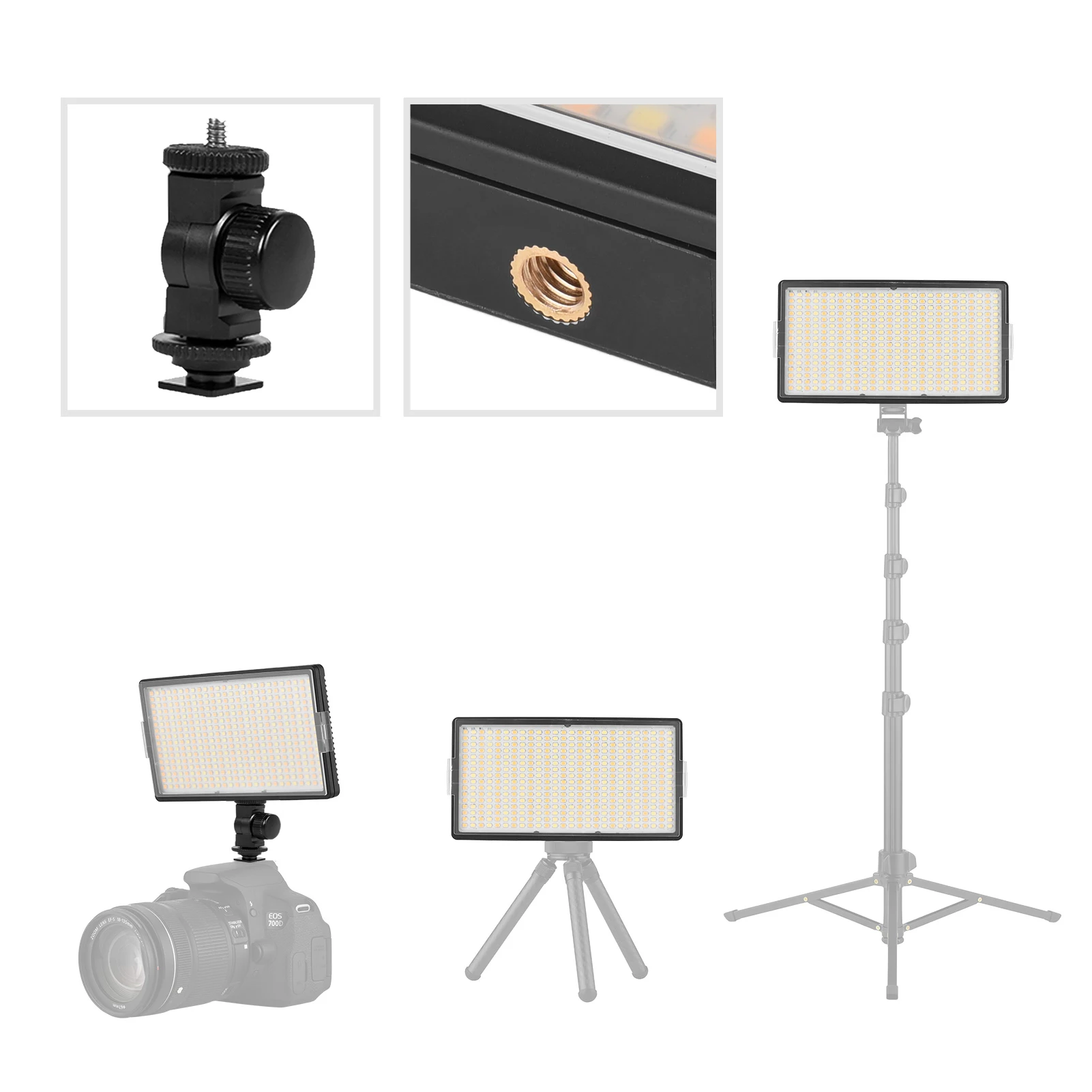 [Cabezal de bola giratorio, soporte de zapata fría e interfaz de orificio para tornillo de 1/4 de pulgada]Conveniente para instalar en una cámara, trípode, soporte de luz y más, ángulos de iluminación fáciles y rápidos a ajustar a través de la rótula giratoria, perfecto para diversas ocasiones como fotografía al aire libre, fotografía de estudio, fotografía de productos, transmisión en vivo, videoconferencia, maquillaje. etc.
