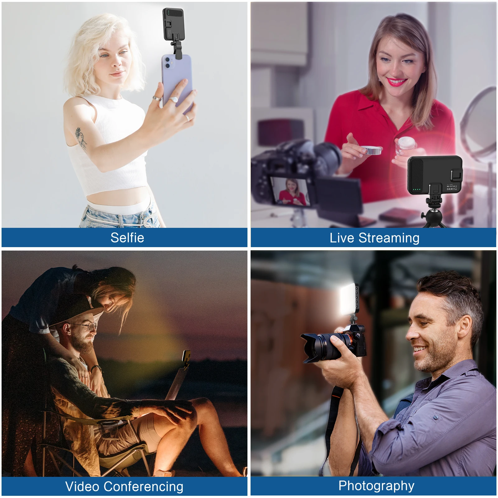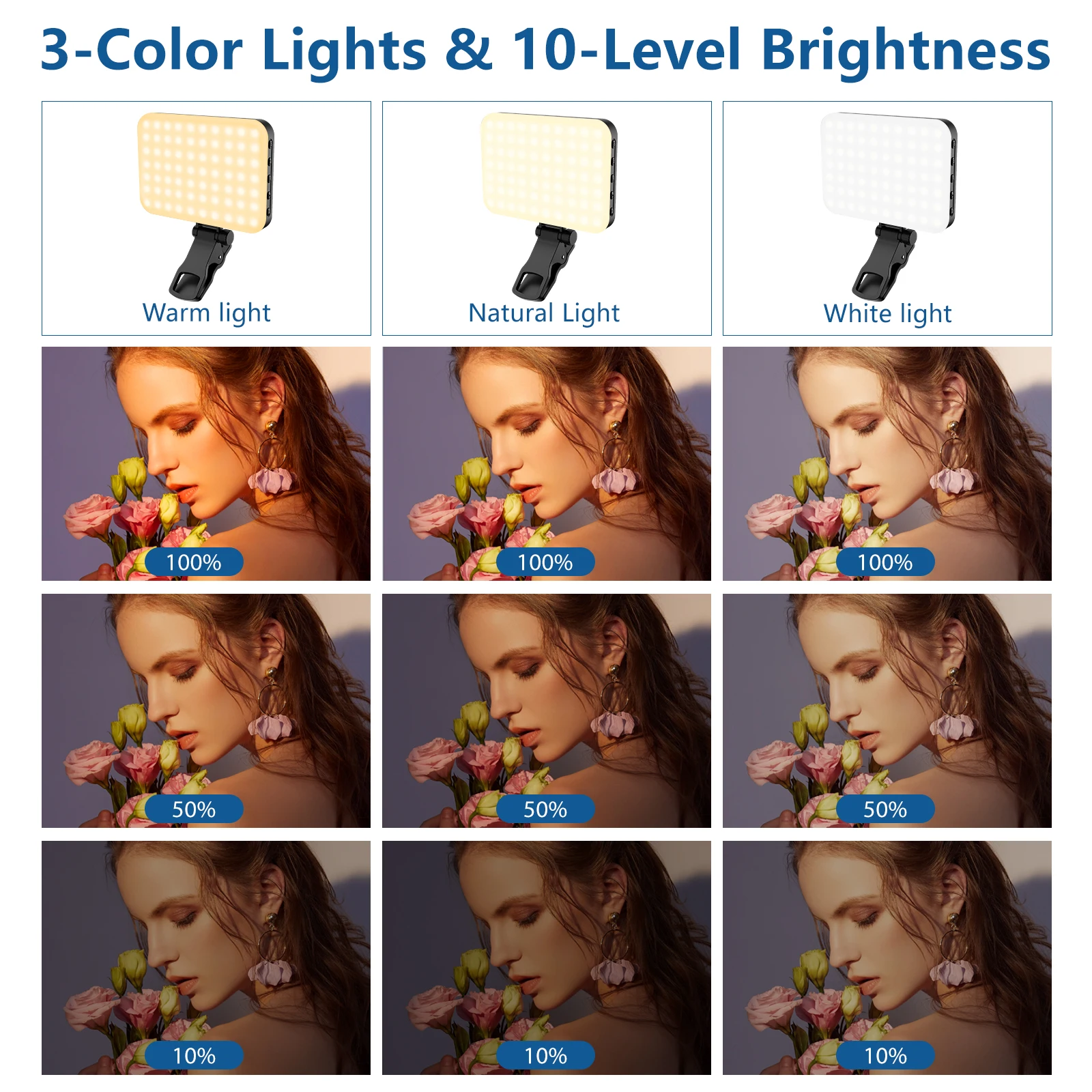 Amplia compatibilidad: esta luz es fácil de colocar en la mayoría de los teléfonos.Compatible con todos los smartphones, tablets, portátiles, etc.La luz de la cámara es una herramienta profesional para crear vídeos en vivo con un teléfono inteligente o una computadora, perfecta para Facebook, YouTube, Twitter, FaceTime, etc.Luz para selfies para iPhone, puede usarla en situaciones como luz de relleno de objetos, presentaciones en vivo, selfies, transmisión en vivo, fotografía o maquillaje para resolver el problema de poca luz y brindarle una mejor experiencia.
