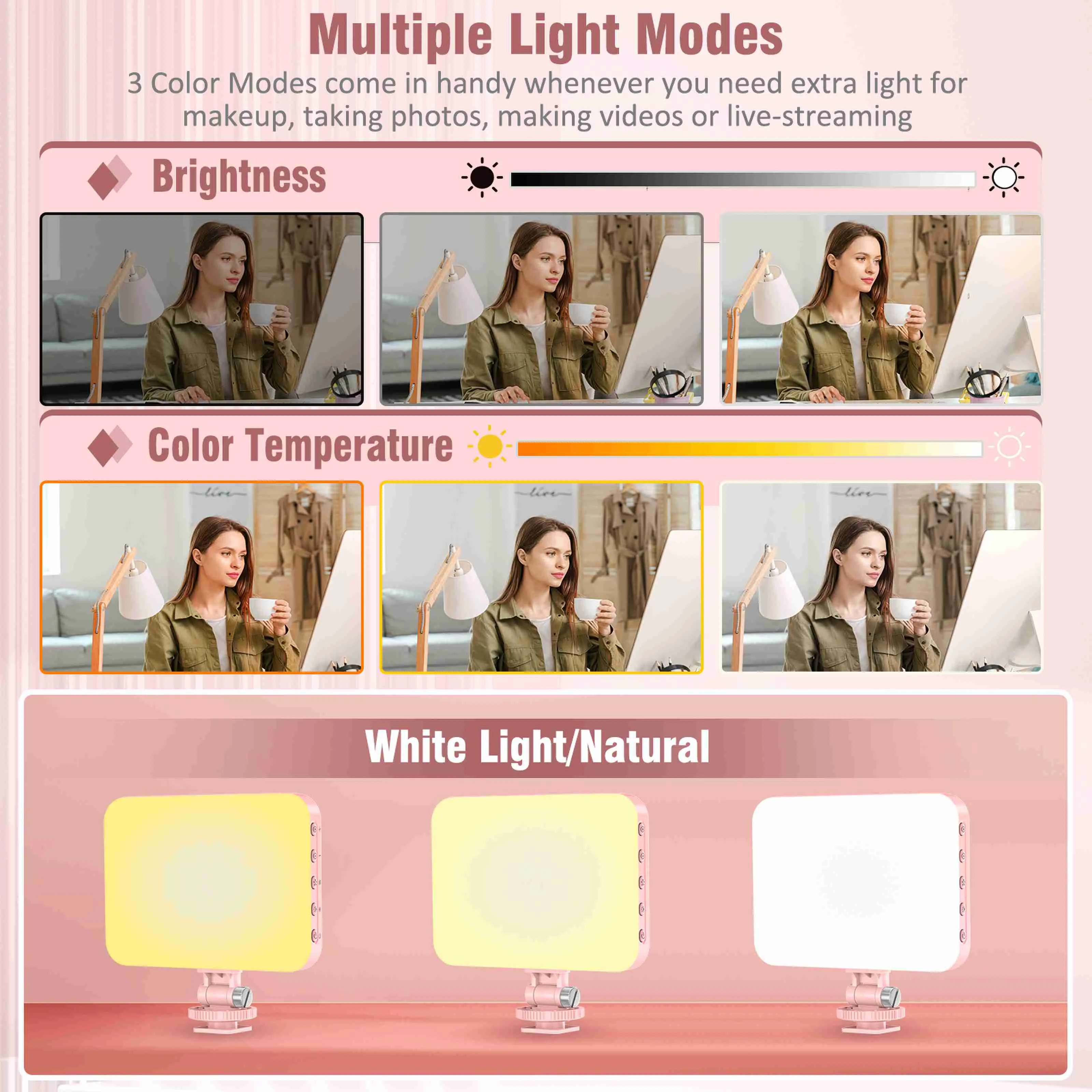 3 modos de luz: la luz para selfies para teléfono tiene 3 modos de luz (blanco brillante, blanco brillante + amarillo cálido, amarillo cálido), ajustes de temperatura de color de 2500K a 9000K que se proporcionan para satisfacer sus diversas necesidades de uso, lo que le permite ser encantador en cualquier situación., como grabación de vídeo, selfies, iluminación de maquillaje, transmisión en vivo