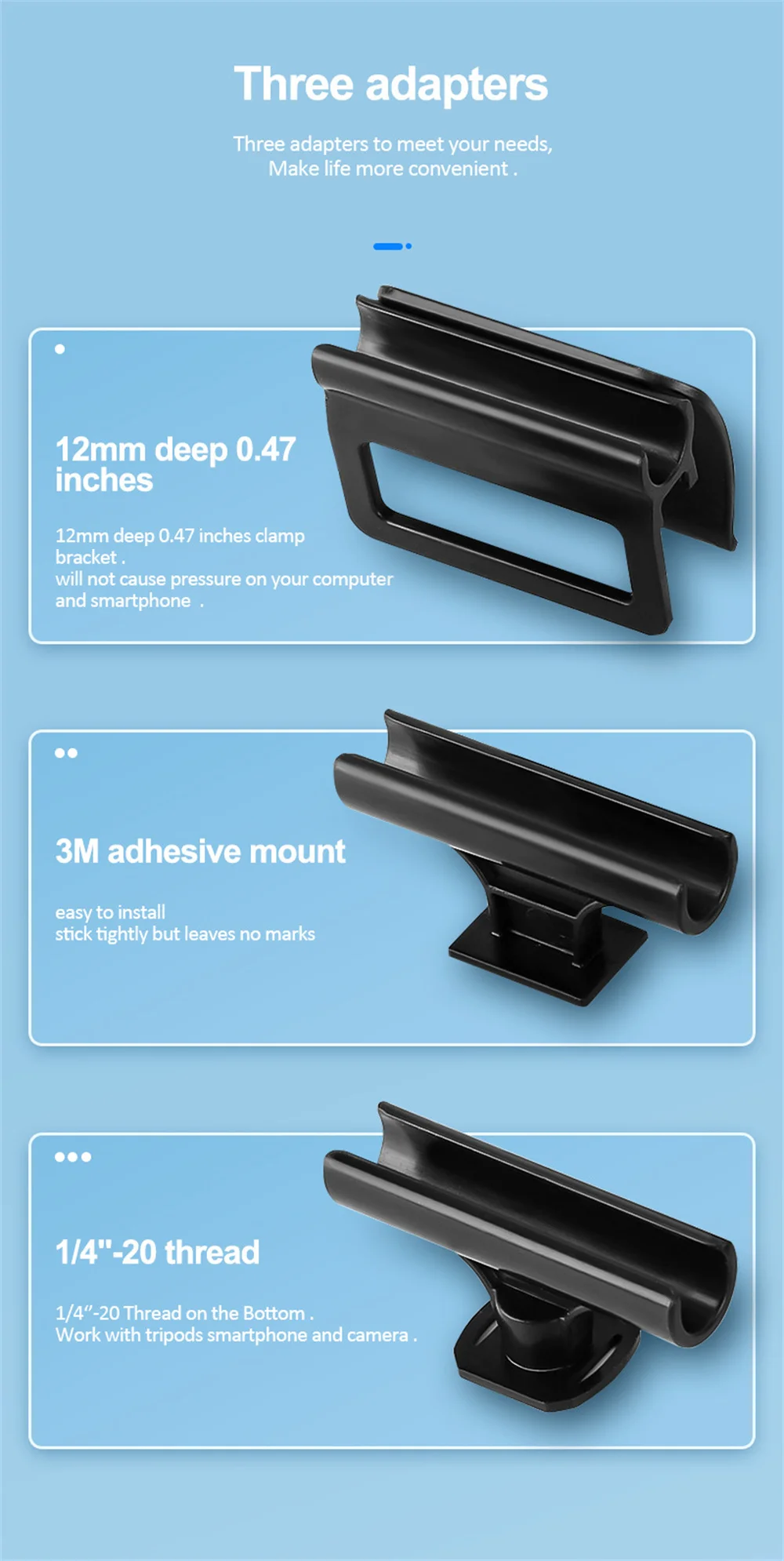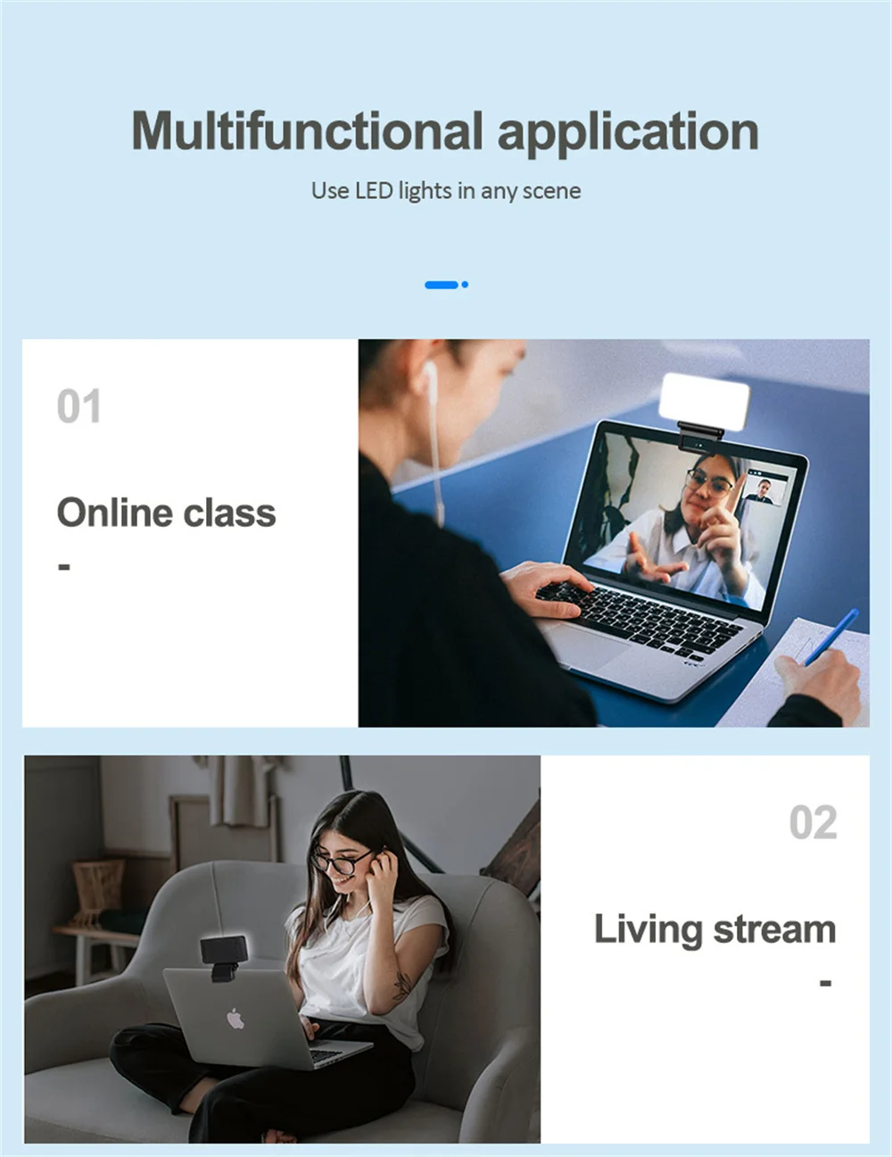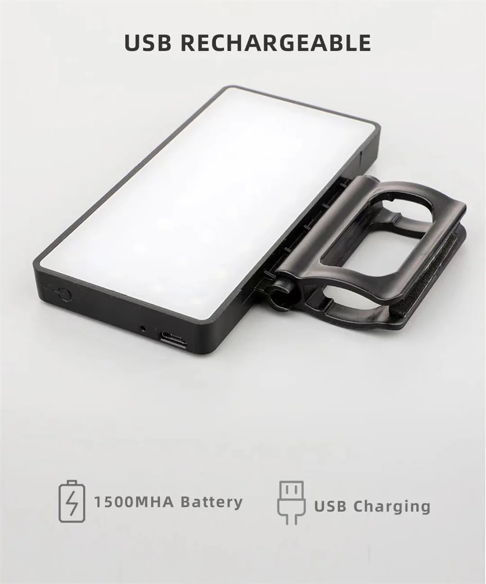 Configuración estándar: clip de monitor/base de conversión de 1/4 ''/base adhesiva 3M Tamaño del producto: 110*54*12mm CRI:90-95 Cuentas de lámpara: 80 Potencia: 5W Temperatura de color: 2600-6000K Tiempo de uso: 3,5 horas (brillo más alto) 12 horas (brillo más bajo) Carga: TYPE-C El Funcionamiento de la luz de relleno monocromática es el siguiente: Presione brevemente la tecla del interruptor para ajustar el brillo monocromático (débil, medio, fuerte) Interfaz tipo C, el pequeño orificio sobre la interfaz es la luz indicadora de carga, carga roja, verde completo.