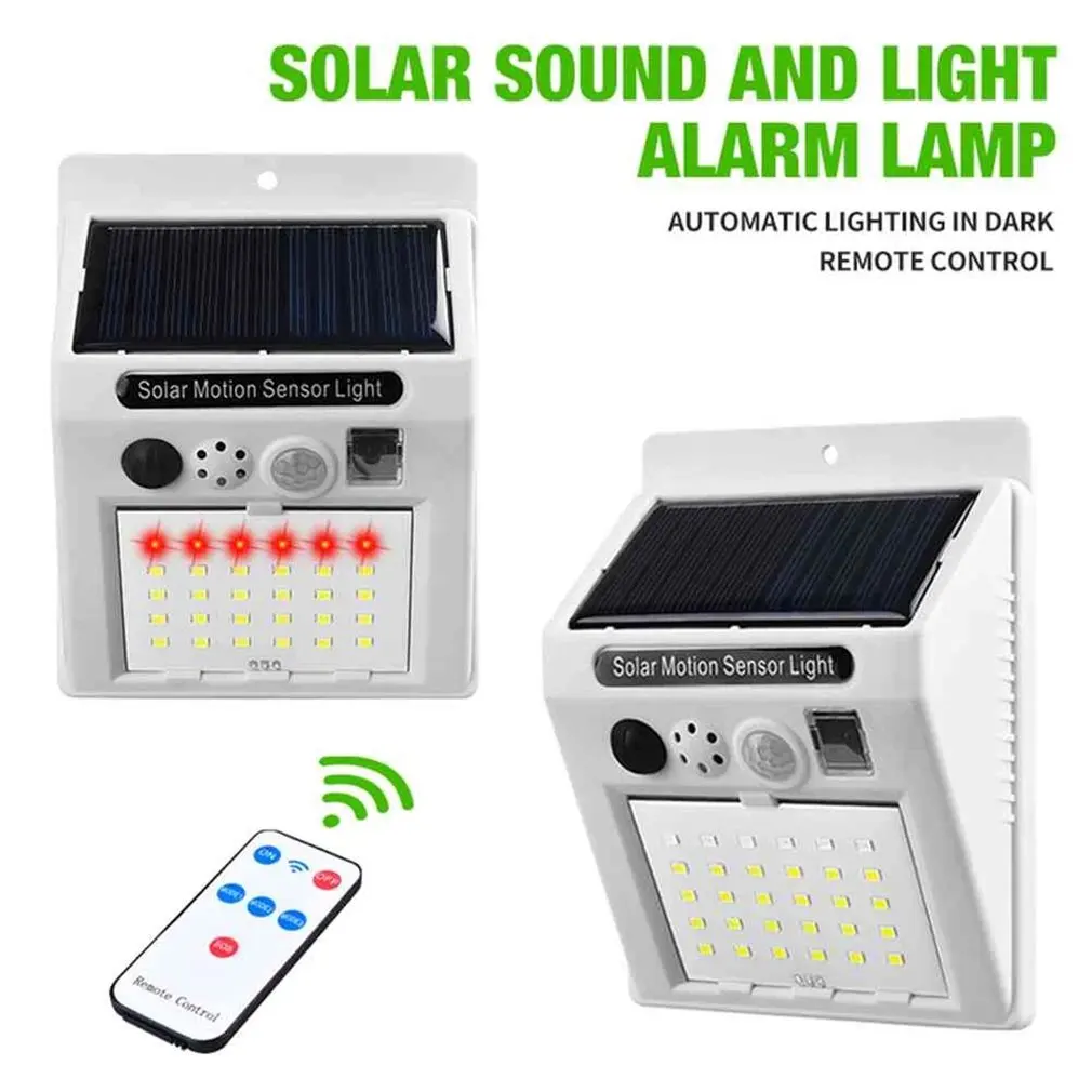 Comprar Luz Solar de advertencia antirrobo, lámpara Led con Sensor de movimiento, impermeable, Control remoto para exteriores, alarma antirrobo, lámpara de pared para huertos