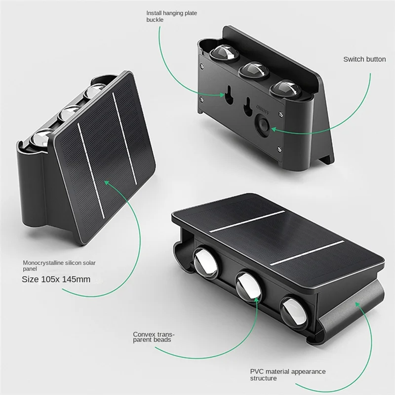 Descripción: panel solar y batería mejorados: nuestras luces de pared solares utilizan el panel solar más nuevo, que tiene una tasa de conversión solar más alta que productos similares en el mercado, se cargará más rápido y funcionará más tiempo. Luz de acento de encendido y apagado automático: Encienda primero el interruptor en la parte posterior de la luz de paso solar antes de usarlo. La luz del sensor de luz solar se carga durante el día y se enciende automáticamente por la noche. Carga con energía solar: si las luces de la cubierta solar están completamente cargadas bajo un sol fuerte 8-10 horas pueden funcionar 6-8 horas por la noche. Ahorre dinero, más verde y protección del medio ambiente, muy bonito y un toque agradable al porche. Impermeable IP65: las luces solares del porche son de color cálido y adecuadas para uso en exteriores. No se preocupe por la lluvia, la nieve, las heladas o el aguanieve. Varios entornos hostiles no afectarán su uso. Iluminación decorativa para exteriores fácil de instalar: Fácil de instalar y fácil de configurar como iluminación exterior o un candelabro de pared de seguridad en la pared exterior. Ideal para decoración de iluminación exterior. Panel solar: silicio monocristalino 6V/1,5 W 18650 batería de litio: 3,7 V/2000mAh Fuente de luz: 4 cuentas Lvming SMD2835 Lumen: 50LM Interruptor de botón + Control de luz, luz cálida monocromática, completamente cargada durante 8-10 horas Material: ABS + acrílico color: Negro Contenido del paquete: 1 x Luz de pared solar (alta asignación) Solo el contenido del paquete anterior, otros artículos no están incluidos. Nota: El reflejo de la luz y las diferentes pantallas pueden hacer que el color del artículo en la imagen sea un poco diferente del real. El error de medición permitido es +/- 1-3cm.