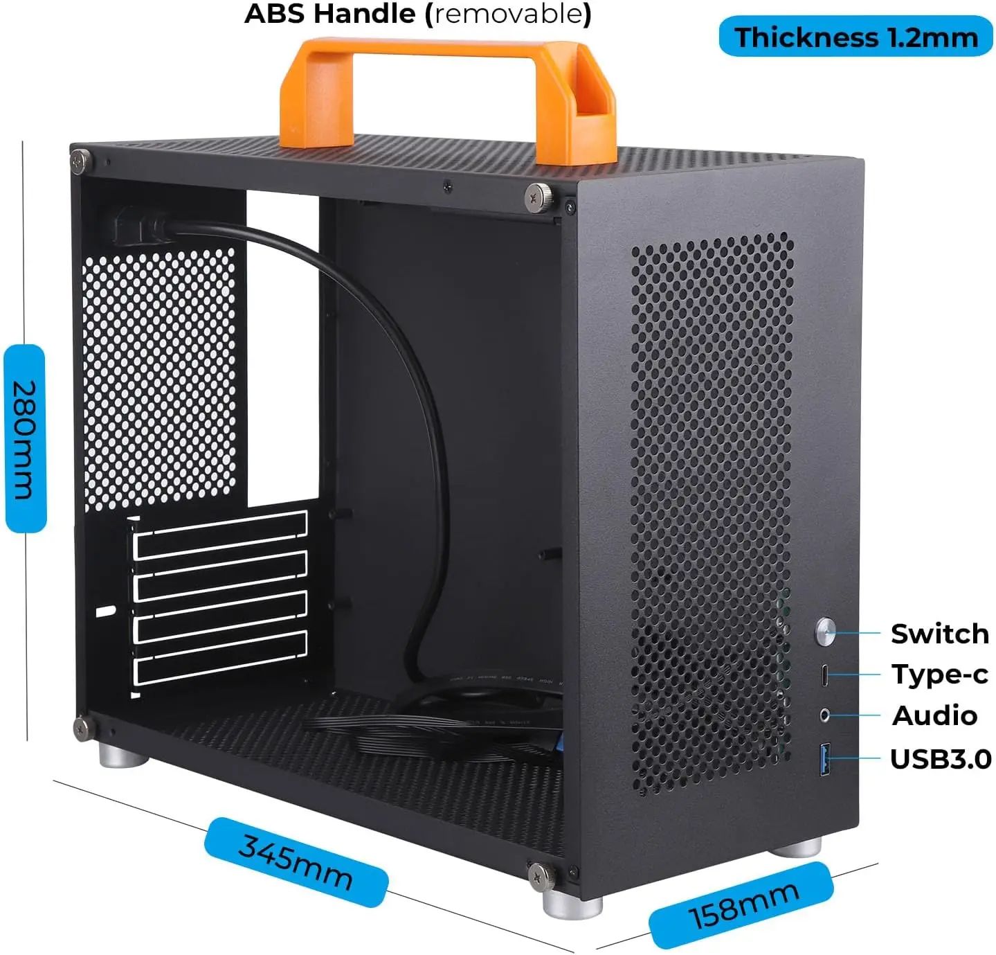 Caja SFF para PC: Tamaño mini 345 mm * 158 mm * 280 mm.Caja de PC con factor de forma pequeño de torre Micro-ATX, compatible con placa base matx (244 * 244 mm) y mini itx (1170 * 170 mm).