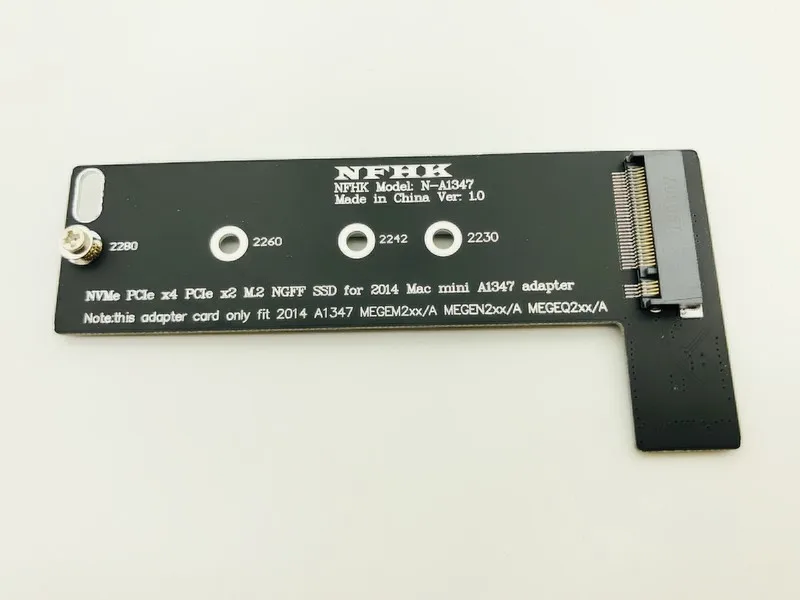 Esta tarjeta elevadora es compatible con 2280 2260 2242 2230 PCIE x4 and PCIE x2 protocol M.2 NGFF SSD solid state drive converted to Late 2014 version of Mac mini A1347 (MGEM2xx/A MGEN2xx/A MGEQ2xx/A) model computer hard drive
