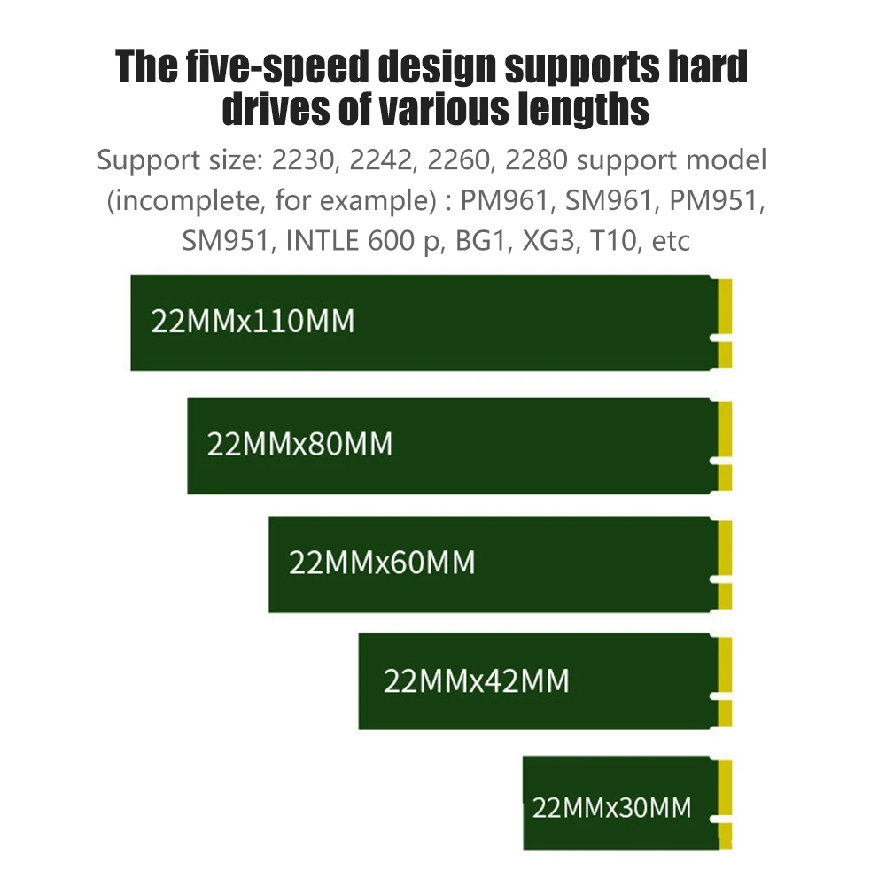 Admite SSD NGFF de formato de módulo 2230, 2242, 2260, 2280 22110MM Obtenga 2 claves NGFF M.2 B y 1 interfaz NGFF M.2 M Key Se pueden utilizar 5 orificios para tornillos 2230/2242/2260/2280/22110MM para fijar la tarjeta SSD NGFF Se pueden utilizar 5 orificios para tornillos para fijar la placa PCB Admite múltiples sistemas operativos, como Windows, Win CE y Linux, etc. 1. Admite ranuras PCIe x4, x8, x16, 2. Cumple con la especificación PCI Express M.2 1.0 3. Cumple con las especificaciones SATA III, 4. Especificación Serial ATA versión 3.2 5. Admite velocidad de transmisión de datos de hasta 6,0 Gb/s 6. Conecte el SATA de la placa base al SSD de la clave NGFF B, 7. El PCIE de la placa base está conectado al SSD de la clave NGFF M 8. Soporte basado en NGFF SSD SATA Este producto solo admite NGFF del protocolo PCIE, pero no admite NGFF del protocolo SATA. Material: PCB Color: como se muestra Contenido del paquete: 1 tarjeta adaptadora. 1 cable SATA. 1 destornillador. 1 juego x tornillos 1 deflector. Solo el contenido del paquete anterior, otros productos no están incluidos. Nota: Los reflejos de la luz y las diferentes pantallas pueden hacer que el color del elemento en la imagen sea un poco diferente al real. El error de medición permitido es +/- 1-3 cm.