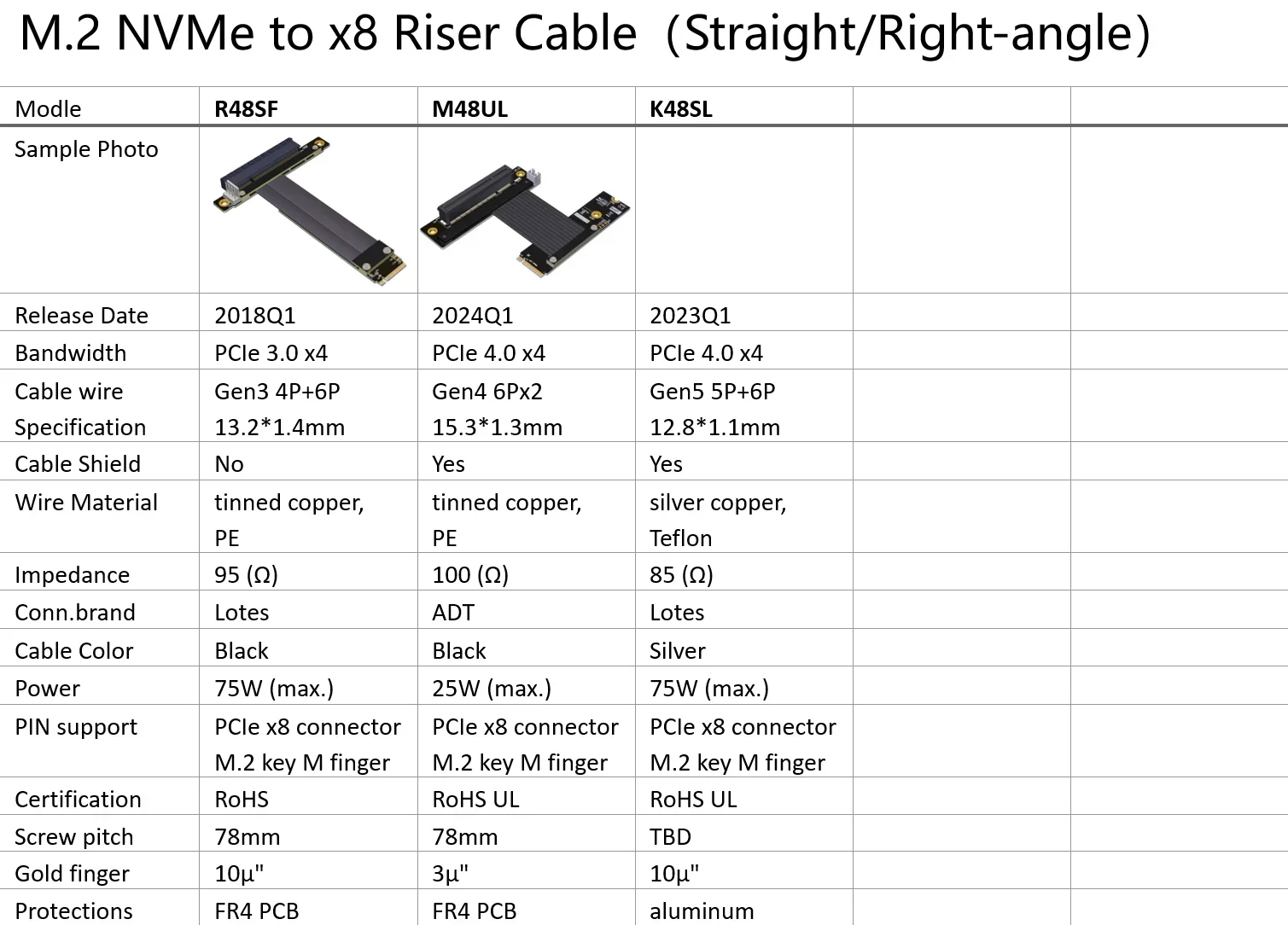 Número de piezaDescripciónAncho de banda (máx.)M48UFM.2 key-M NVMe a PCIe x8 turn Cables de extensión vertical de férula de 180 gradosPCIe 4,0x4 (64G/BPS)M48ULCables de extensión vertical de férula de 90 grados M.2 key-M NVMe a PCIe x8PCIe 4,0x4 (64G/BPS)M48URM.2 key-M NVMe a PCIe x8 turn Cables de extensión vertical de férula de 270 gradosPCIe 4,0x4 (64G/BPS)M48: M.2 NVMe a PCIe x8