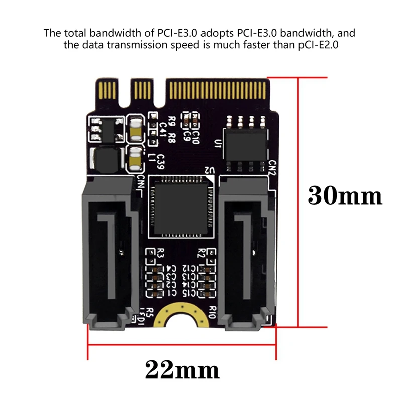 Dos interfaces SATA están equipadas con dos interfaces SATA estándar.Los usuarios solo necesitan insertar esta tarjeta en la ranura M.2 de la placa base y luego conectar dos unidades de estado sólido o discos duros mecánicos con interfaz SATA al mismo tiempo a través del cable de datos SATA.
